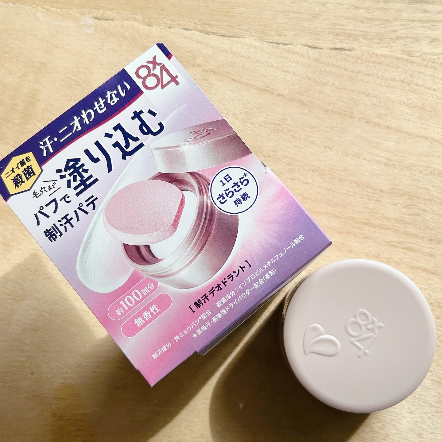 新タイプの制汗デオドランド剤『8x4デオドラントパテ』新発売 汗・ニオイに悩んでいるお客様に向け、ワキなど汗・ニオイが気になる箇所に、クッションパフで柔らかい「パテ」を塗り込むことで、毛穴まで入り込んでピタッと密着する さらさら感を実現し、汗が気になる時でも1日ずっとさらさらが持続、また、殺菌成分が汗のニオイの元となるニオイ菌を殺菌して1日ずっと汗ニオわせません。