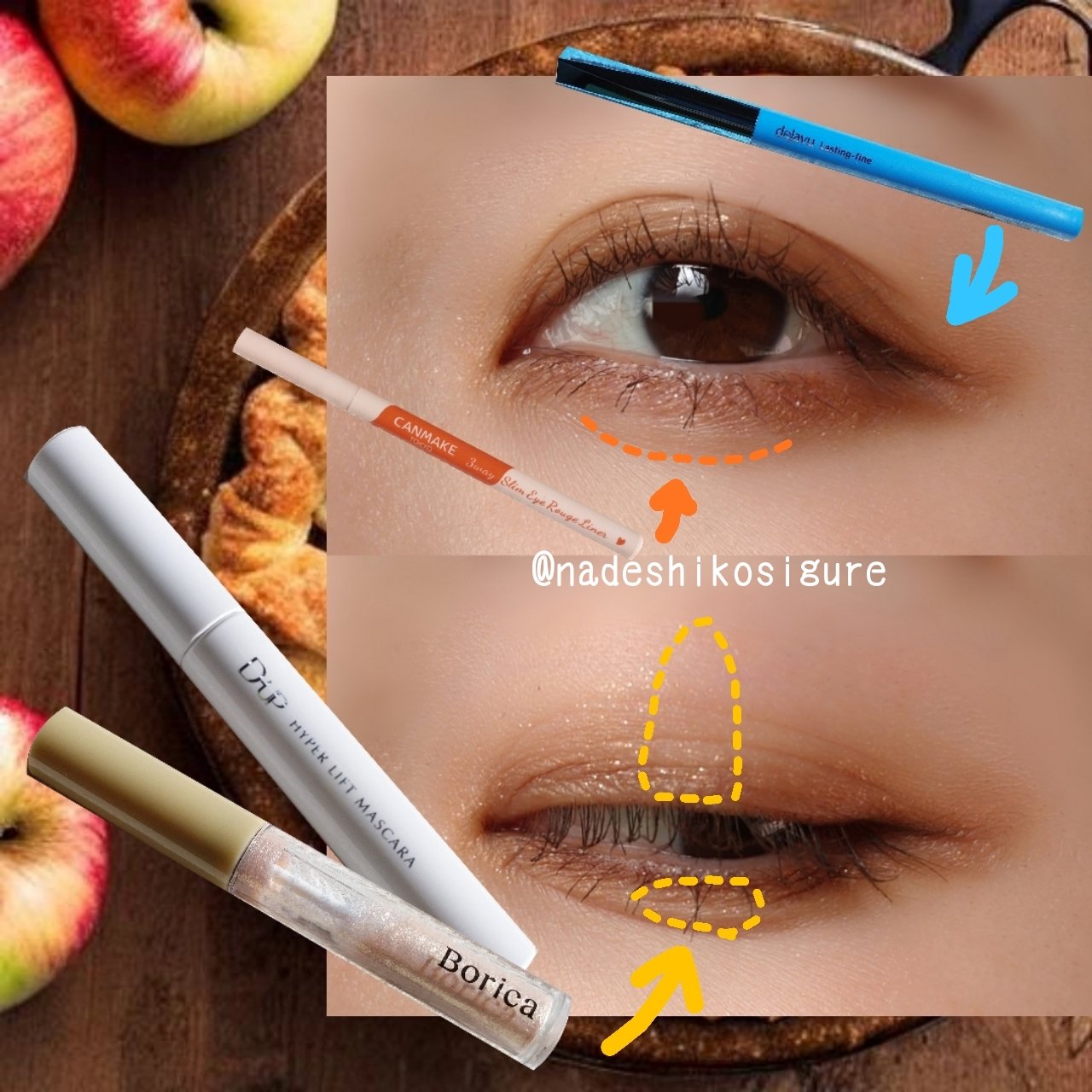 CEZANNE 極細アイブロウマスカラ C3シナモンブラウン さらっと眉毛を染める ETUDE プレイカラー アイシャドウ ベイクハウス Aで上まぶたの目頭から黒目に向けてさらっと広げる。 D-UPディーアップ ハイパーリフトマスカラ ブラック