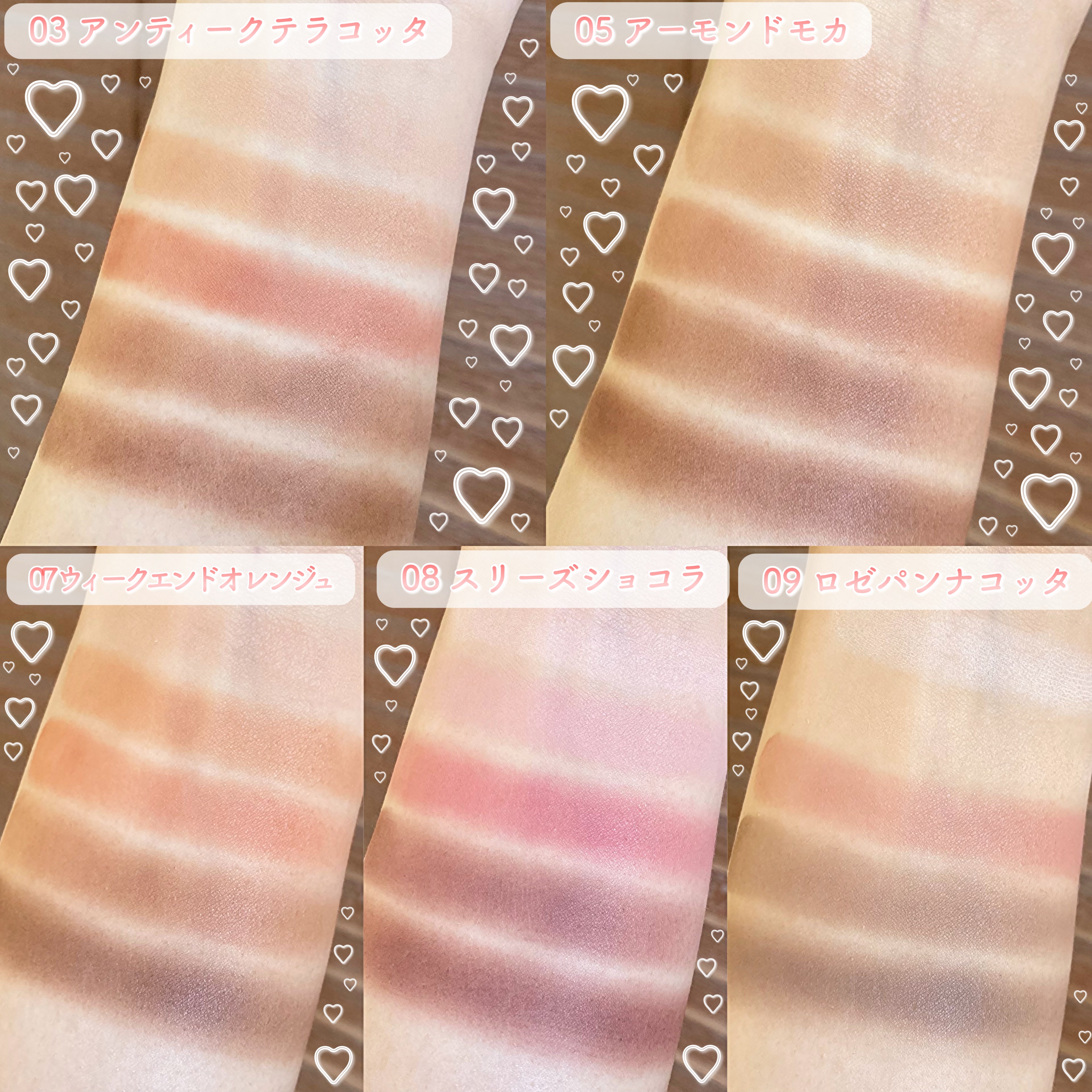 - <03 アンティークテラコッタ> タルク、合成フルオロフロゴパイト、酸化鉄、リンゴ酸ジイソステアリル、硫酸Ba、ダイマージリノール酸(フィトステリル/イソステアリル/セチル/ステアリル/ベヘニル)、トリ(カプリル酸/カプリン酸)グリセリル、シリカ、ミリスチン酸亜鉛、ラウロイルリシン、イソノナン酸イソノニル、ジメチコン、ハイドロゲンジメチコン、ステアロイルグルタミン酸2Na、マイクロクリスタリンワックス、エチルパラベン、メチルパラベン、水酸化Al、エチルヘキシルグリセリン、カプリリルグリコール、水、デヒドロ酢酸Na、アルガニアスピノサ核油、ホホバ種子油、水添ポリイソブテン、PG、BG、ヒアルロン酸Na、フェノキシエタノール、カミツレ花エキス、センチフォリアバラ花エキス、マイカ、グンジョウ、酸化チタン、赤226、赤202 <05 アーモンドモカ> タルク、合成フルオロフロゴパイト、酸化鉄、リンゴ酸ジイソステアリル、硫酸Ba、ダイマージリノール酸(フィトステリル/イソステアリル/セチル/ステアリル/ベヘニル)、トリ(カプリル酸/カプリン酸)グリセリル、マイカ、シリカ、ミリスチン酸亜鉛、ラウロイルリシン、イソノナン酸イソノニル、ジメチコン、ステアロイルグルタミン酸2Na、酸化チタン、ハイドロゲンジメチコン、マイクロクリスタリンワックス、エチルパラベン、メチルパラベン、エチルヘキシルグリセリン、カプリリルグリコール、水酸化Al、水、デヒドロ酢酸Na、アルガニアスピノサ核油、ホホバ種子油、水添ポリイソブテン、PG、BG、ヒアルロン酸Na、フェノキシエタノール、カミツレ花エキス、センチフォリアバラ花エキス、赤226、グンジョウ <08 スリーズショコラ> タルク、合成フルオロフロゴパイト、硫酸Ba、リンゴ酸ジイソステアリル、ダイマージリノール酸(フィトステリル/イソステアリル/セチル/ステアリル/ベヘニル)、トリ(カプリル酸/カプリン酸)グリセリル、シリカ、ラウロイルリシン、ミリスチン酸亜鉛、イソノナン酸イソノニル、ジメチコン、水酸化Al、ハイドロゲンジメチコン、マイクロクリスタリンワックス、エチルパラベン、メチルパラベン、ステアロイルグルタミン酸2Na、カプリリルグリコール、エチルヘキシルグリセリン、水、デヒドロ酢酸Na、アルガニアスピノサ核油、ホホバ種子油、水添ポリイソブテン、PG、BG、ヒアルロン酸Na、フェノキシエタノール、カミツレ花エキス、トコフェロール、センチフォリアバラ花エキス、酸化鉄、酸化チタン、グンジョウ、赤226、カオリン <09 ロゼパンナコッタ> タルク、合成フルオロフロゴパイト、硫酸Ba、リンゴ酸ジイソステアリル、ダイマージリノール酸(フィトステリル/イソステアリル/セチル/ステアリル/ベヘニル)、トリ(カプリル酸/カプリン酸)グリセリル、シリカ、ラウロイルリシン、ミリスチン酸亜鉛、イソノナン酸イソノニル、ジメチコン、ハイドロゲンジメチコン、マイクロクリスタリンワックス、エチルパラベン、メチルパラベン、カプリリルグリコール、エチルヘキシルグリセリン、水、デヒドロ酢酸Na、水酸化AI、ステアロイルグルタミン酸2Na、アルガニアスピノサ核油、ホホバ種子油、イソドデカン、PG、BG、ヒアルロン酸Na、フェノキシエタノール、カミツレ花エキス、トコフェロール、センチフォリアバラ花エキス、BHT、酸化鉄、酸化チタン、グンジョウ、赤226、カオリン <02 アーバンキャメル> 合成フルオロフロゴパイト、タルク、酸化鉄、リンゴ酸ジイソステアリル、硫酸Ba、ダイマージリノール酸(フィトステリル/イソステアリル/セチル/ステアリル/ベヘニル)、トリ(カプリル酸/カプリン酸)グリセリル、シリカ、ミリスチン酸亜鉛、ラウロイルリシン、イソノナン酸イソノニル、ジメチコン、ハイドロゲンジメチコン、マイクロクリスタリンワックス、ステアロイルグルタミン酸2Na、エチルパラベン、メチルパラベン、エチルヘキシルグリセリン、カプリリルグリコール、水、デヒドロ酢酸Na、水酸化Al、アルガニアスピノサ核油、ホホバ種子油、水添ポリイソブテン、PG、BG、ヒアルロン酸Na、フェノキシエタノール、カミツレ花エキス、センチフォリアバラ花エキス、マイカ、酸化チタン <04 クラシックピンク> タルク、合成フルオロフロゴパイト、酸化鉄、硫酸Ba、リンゴ酸ジイソステアリル、ダイマージリノール酸(フィトステリル/イソステアリル/セチル/ステアリル/ベヘニル)、トリ(カプリル酸/カプリン酸)グリセリル、シリカ、ミリスチン酸亜鉛、ラウロイルリシン、グンジョウ、イソノナン酸イソノニル、ジメチコン、ハイドロゲンジメチコン、赤202、マイクロクリスタリンワックス、ステアロイルグルタミン酸2Na、エチルパラベン、メチルパラベン、水酸化Al、エチルヘキシルグリセリン、カプリリルグリコール、赤226、水、デヒドロ酢酸Na、アルガニアスピノサ核油、ホホバ種子油、水添ポリイソブテン、PG、BG、ヒアルロン酸Na、フェノキシエタノール、カミツレ花エキス、センチフォリ