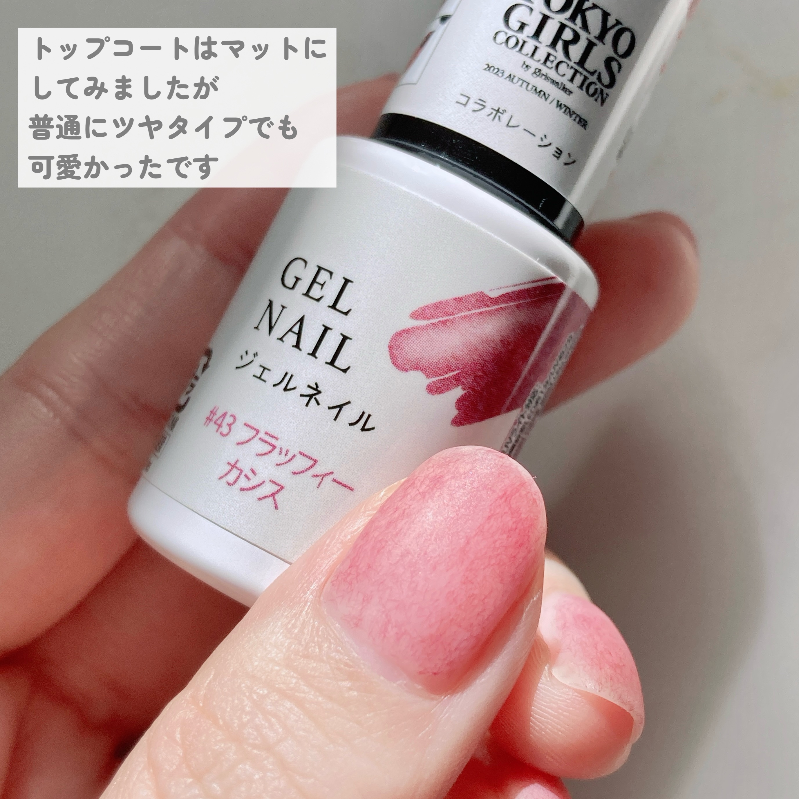 1週間経ちましたが カラーのおかげかトップがマットなおかげかわからないですが いつもより格段にモチがよいです 爪先だけ磨耗してツヤがでてきてしまってる部分がありますが マット感も維持されています