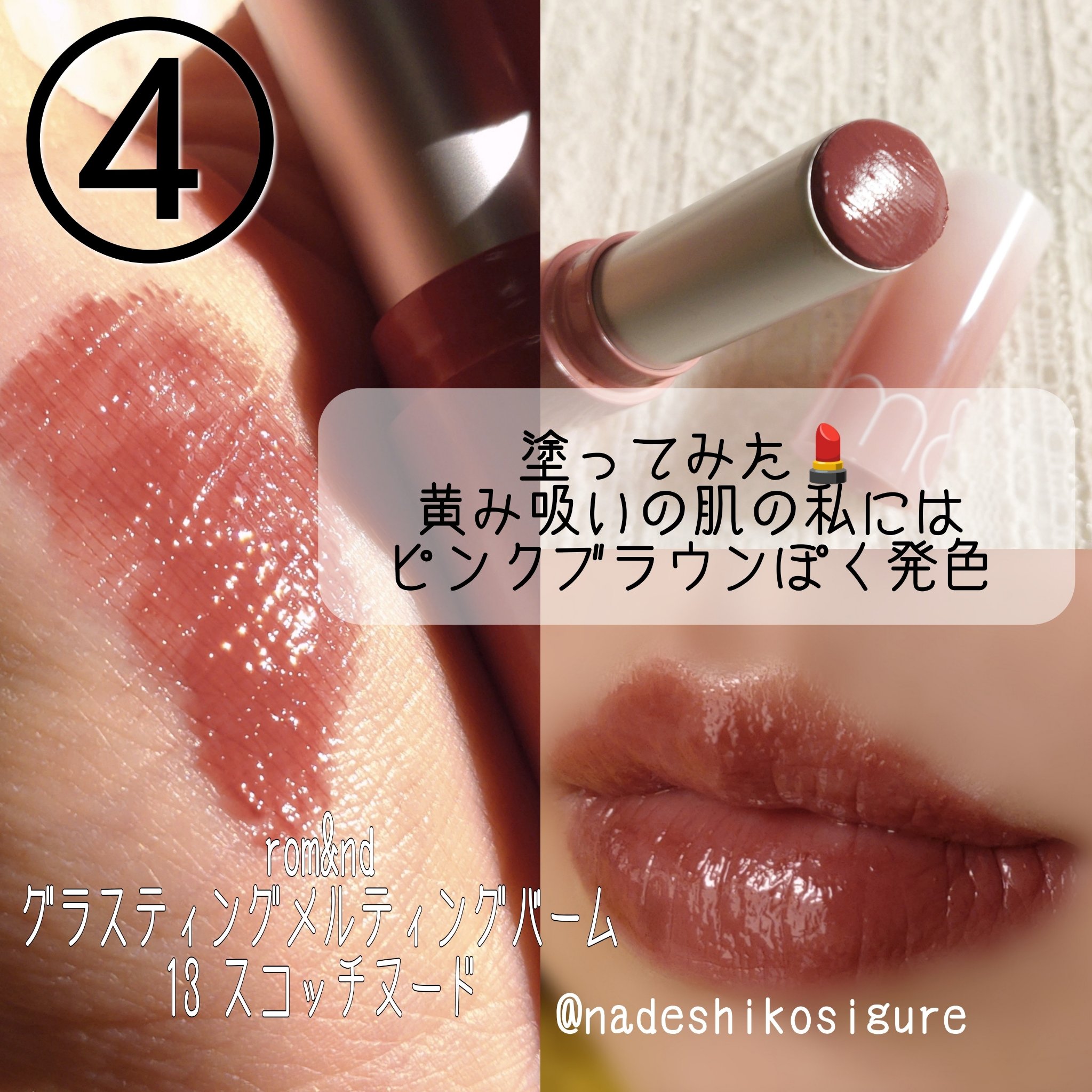 黄み吸いの私による唇に乗せた状態でのブラウンリップ と考えて作っているので、それブラウンじゃないんじゃない?とか思ってもご容赦ください…🥲 このリップ好きすぎてリピートしてる、今2本目。 スウォッチでも黄みがしっかりわかって、唇に塗ってもしっかりオレンジブラウンになる。 ナチュラルにもデートメイクにも使えるブラウンリップ。 1度塗りにするとナチュラルな透けブラウンリップに。