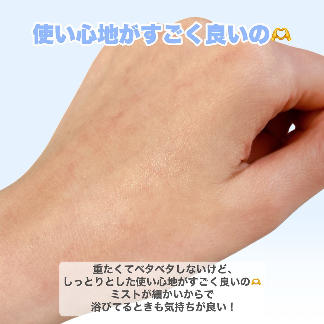 ハイドロコンプレックス*2配合で肌を柔らげうるおいを引き込み蓄える独自の浸透保湿処方。 ミストタイプの美容液で、肌馴染みが良いです。特に乾燥が気になる時にぴったりで、手軽に使えるのがよかった! ビタミンC誘導体*3とグルタチオン*4が配合されているので、毛穴の目立たない透明感あるスベスベ白玉肌に✨