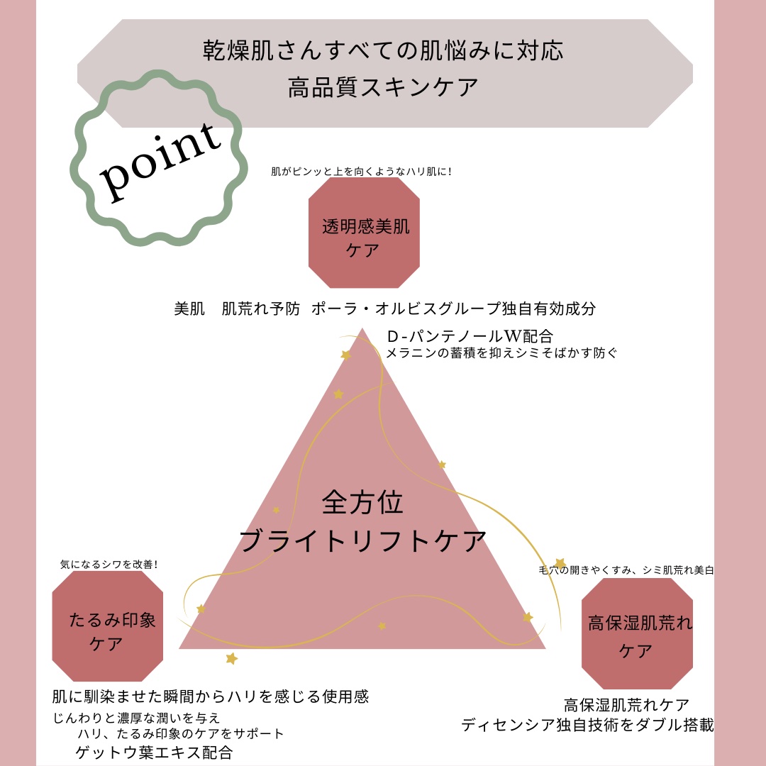 - 【医薬部外品】 敏感肌・ゆらぎがちな肌にも心地よい、 さらなる進化を遂げたディセンシア最高峰クリーム。 透明感美白*1ケア・若々しい肌印象ケア*2・高保湿肌荒れ予防ケアの3つすべてを1品で叶えます。7つのブライトリフト・テクノロジー*3が集結し、肌でじゅわっととろけて、パッと輝きをもたらし、ピンとストレッチフィット。 溢れだす深く上質なうるおいで包み込み、明るい印象の引き締まった肌へ。 美白・肌荒れ有効成分「D-パンテノールW*4」配合 *1 メラニンの蓄積を抑え、シミ・そばかすを防ぐこと *2 ハリを保つことによる *3 ポーラ・オルビスグループ独自有効成分D-パンテノールW(デクスパンテノールW)配合・ディセンシア独自成分セラミドナノスフィア(保湿成分)配合・若々しい肌印象ケアをサポートするゲットウ葉エキス(保湿成分)配合・ハリ を感じさせるリフティングシールド・立体角層(ふっくらとうるおいに満ちた角層のこと)へ導くバスケットウィーブ®処方・角層をサポートするワイルドタイムエキス(タイムエキスー1: 保湿成分)配合・透明感をサポートするアーティチョークエキス(保湿成分)配合 *4 デクスパンテノールW