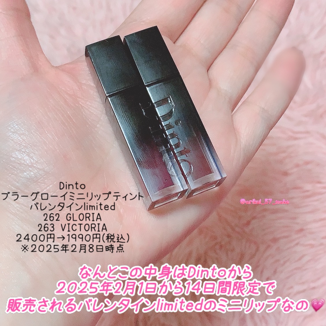 パッケージかわいい&みんな大好きミニサイズ「VALENTINE'S LIMITED Blur-Glowy Mini Lip Tint Duo」です✨ クランベリー果汁が染み込んだ チェリーブルーネット ミルクチョコレートカラー。 ジューシーな付け心地が、Dintoだなあって思いました♥️ しっかり色づいて、でも見た目にはわからないプルっと感が良きなんです。