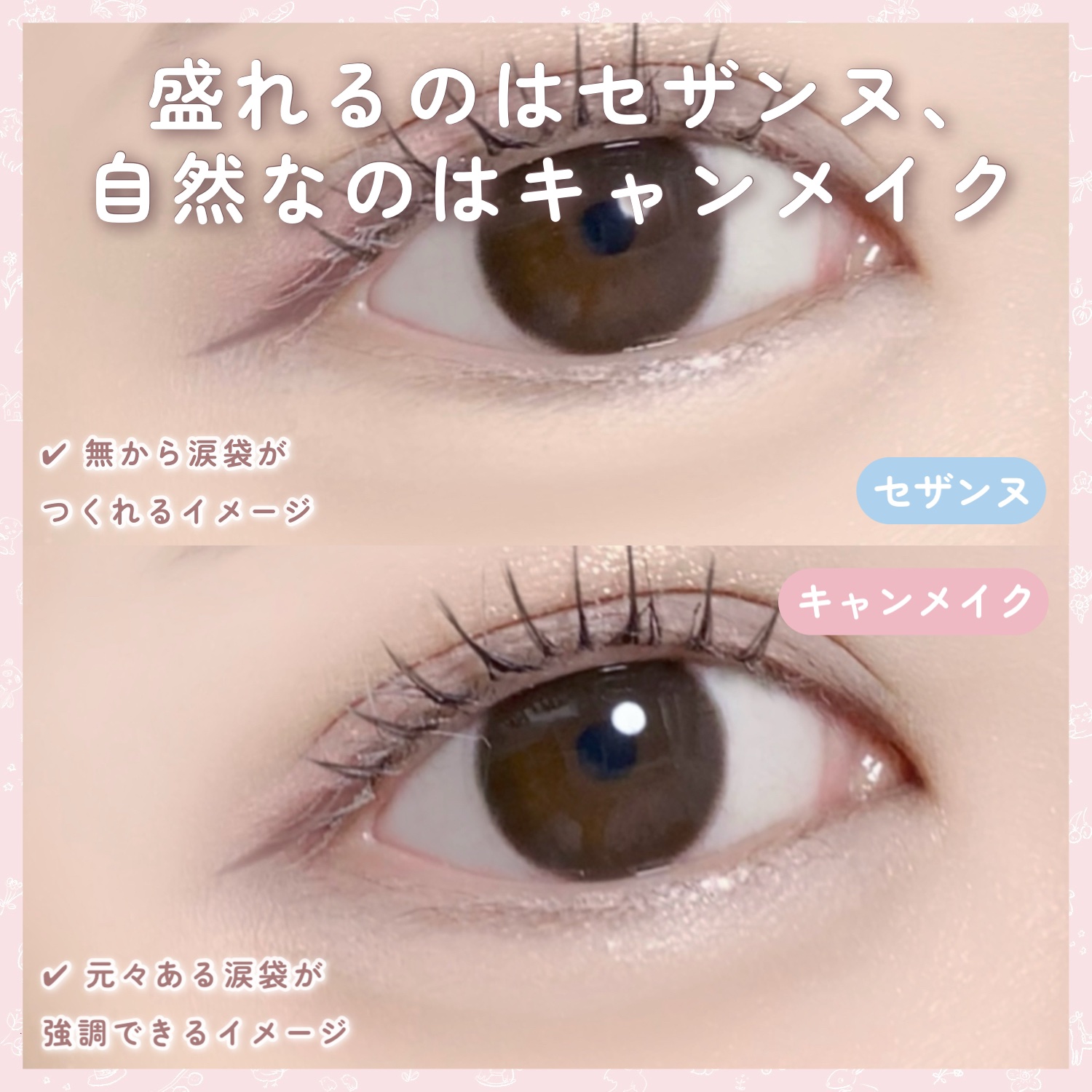 肌なじみのいいベージュカラー この中で1番ナチュラル 元々涙袋ある人みたいな仕上がり ほんのりピンクベージュカラー この中で1番ぷっくり感出る どんなメイクにも合わせやすい 女の子っぽいちごみるくカラー この中で1番発色が強め しっかり盛りたい人向け