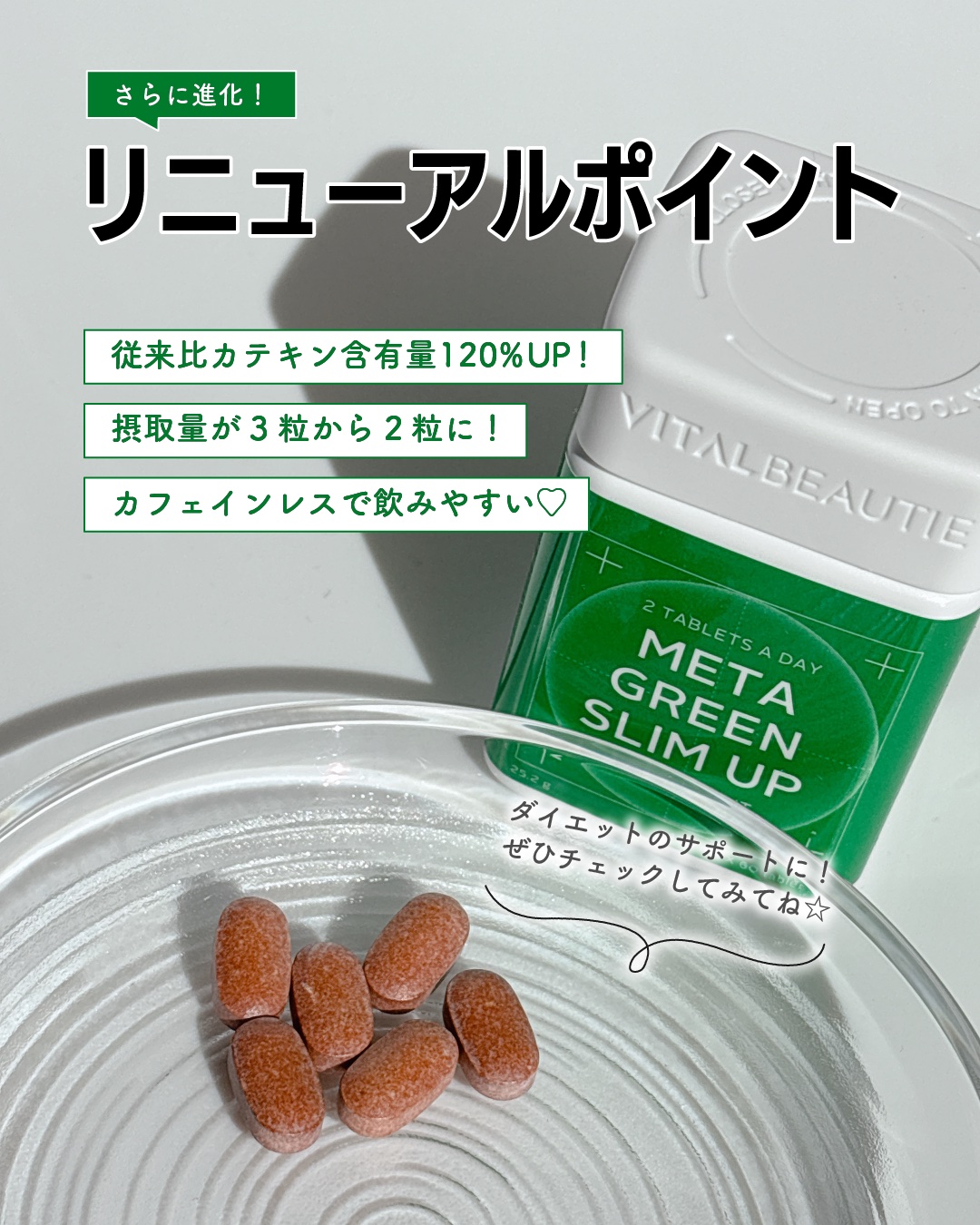 ✿バイタルビューティー✿メタグリーンスリムアップ30日分オリーブヤング健康機能食品1位*を獲得した脂肪燃焼サプリ💊体脂肪の減少を手伝ってくれる緑茶カテキンが高配合されていて、食事後の脂肪の吸収を抑えて排出を手伝ってくれる商品✨️食後に1日2粒...