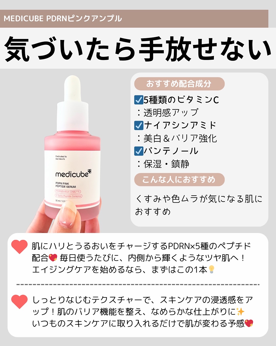 スキンケア迷子さん必見👀💕肌悩みに合わせて選べるメディキューブの美容液4種類、使ったことある?それぞれ配合されてる成分も違うから今の肌にぴったりの1本が見つかるかも✨「シミが気になる…」「最近なんかくすんでる」「乾燥が止まらん!」ってときも頼...