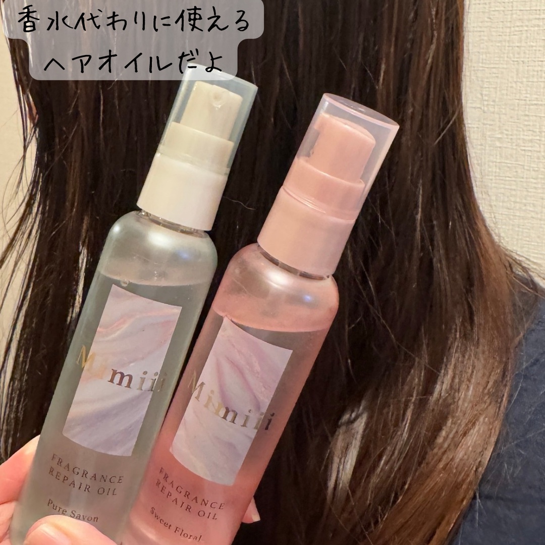 香水代わりに使えるうるつやヘアオイル🤍🫧 10種類の植物エキス*とケラチンの補修成分配合でうるおいのあるちゅるんとした髪へ✨ サラッとしたヘアオイルでベタつかず 軽いつけ心地だから重い仕上がりが苦手の方にオススメだよ! スウィートフローラル🌸は華やかなフローラル系で ピュアサボン🧼は清潔感のある石鹸の香り♪