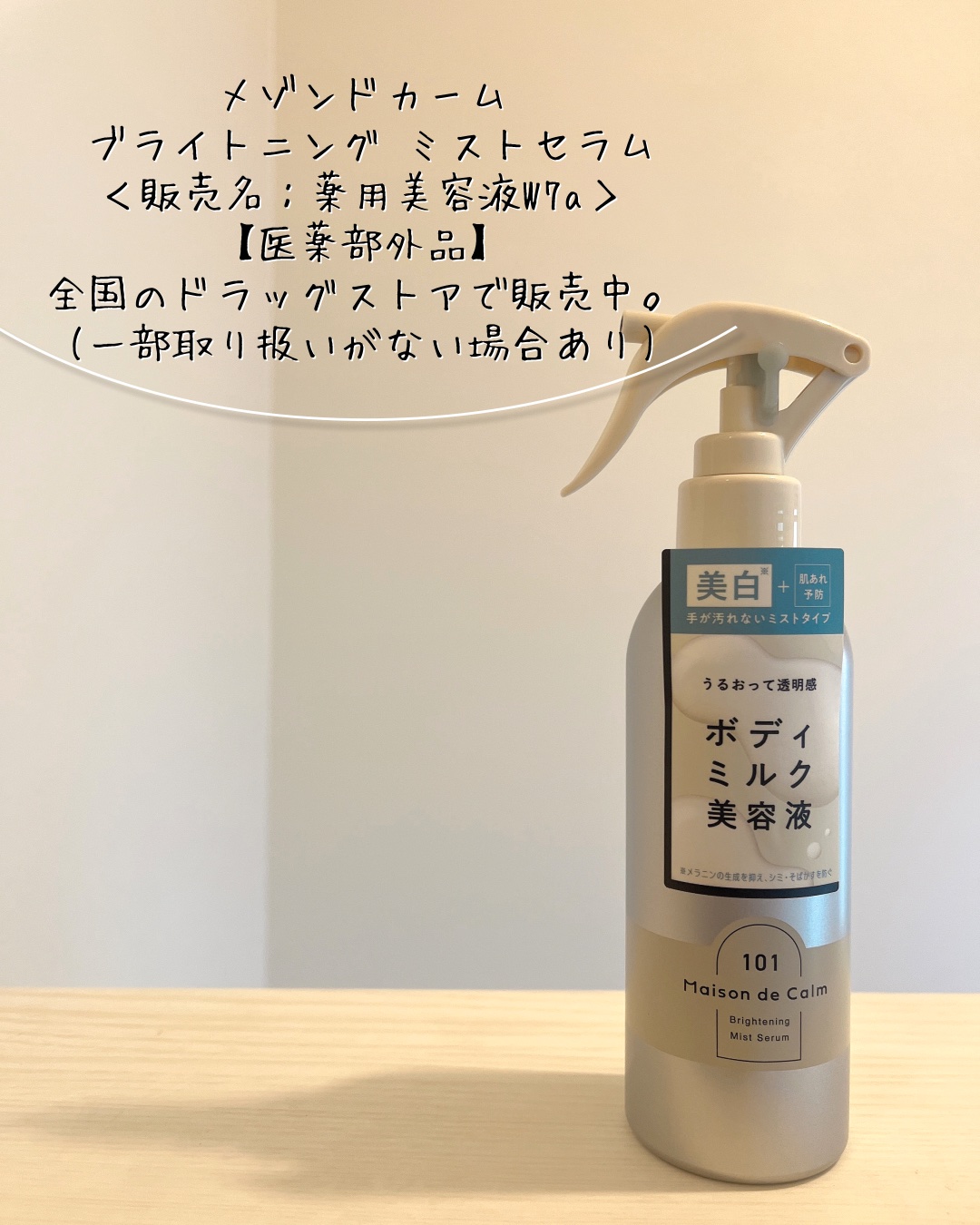 - 【医薬部外品】 片手でシュッとケアできる ミストタイプのボディ用美白*1美容液 ●ミルク状の美容液をナノサイズ化する独自技術で、肌の上にとどまりがちな保湿成分が角質層まで浸透。 ●べたつかずにしっかり潤って透明感のあふれる肌へ。 ●逆さにしても使えるトリガータイプのスプレーなので、背中のケアにも。 ●医薬部外品の有効成分【プラセンタエキス(1)】【グリチルレチン酸ステアリル】を配合し、全身の美白*1と肌あれ防止を叶えます。 ●ビタミン C 誘導体*2やセラミド*3・カンゾウエキス*4・オウゴンエキス・カワラヨモギエキス・クワエキス・タイソウエキス・アロエエキス*5などの植物性保湿成分配合。 ●アルコールフリー・無鉱物オイル・無タール系色素。 ●爽やかで心地よいホワイトティーの香り。 *1 メラニンの生成を抑え、シミ・ソバカスを防ぐ *2 リン酸 L-アスコルビルマグネシウム *3 N-ステアロイルフィトスフィンゴシン *4 油溶性甘草エキス(2) *5 アロエ液汁末(2) 販売名:薬用美容液W7 a