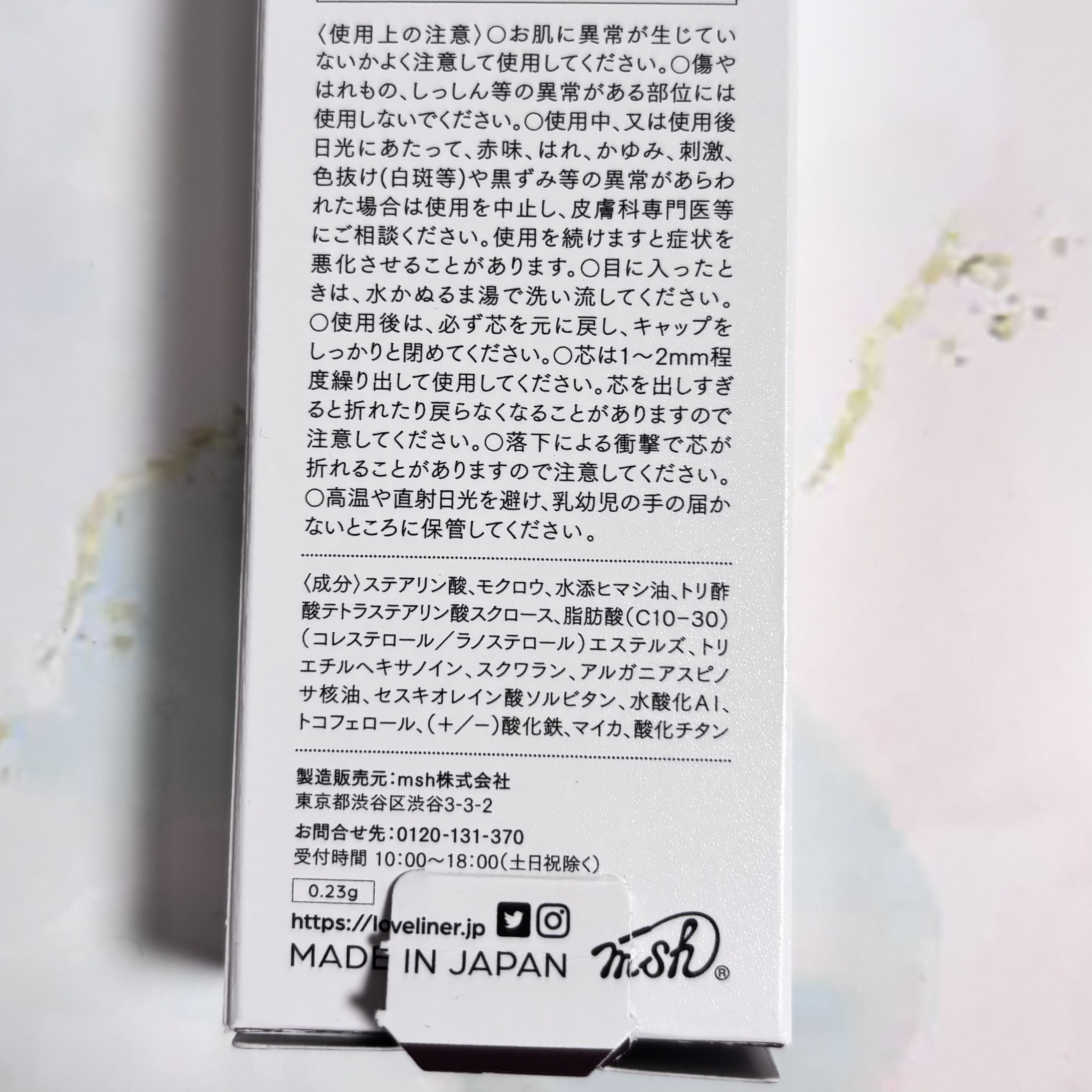 - <グレイッシュブラウン> ステアリン酸、モクロウ、水添ヒマシ油、トリ酢酸テトラステアリン酸スクロース、脂肪酸(C10-30)(コレステロール/ラノステロール)エステルズ、トリエチルヘキサノイン、スクワラン、アルガニアスピノサ核油、セスキオレイン酸ソルビタン、水酸化Al、トコフェロール、(+/-)酸化鉄、マイカ、酸化チタン <キャメルブラウン> ステアリン酸、モクロウ、水添ヒマシ油、トリ酢酸テトラステアリン酸スクロース、脂肪酸(C10-30)(コレステロール/ラノステロール)エステルズ、トリエチルヘキサノイン、スクワラン、アルガニアスピノサ核油、セスキオレイン酸ソルビタン、水酸化Al、トコフェロール、(+/-)酸化鉄、マイカ、酸化チタン <ダスティピンク> ステアリン酸、モクロウ、水添ヒマシ油、トリ酢酸テトラステアリン酸スクロース、脂肪酸(C10-30)(コレステロール/ラノステロール)エステルズ、トリエチルヘキサノイン、スクワラン、アルガニアスピノサ核油、セスキオレイン酸ソルビタン、水酸化Al、トコフェロール、(+/-)酸化鉄、マイカ、酸化チタン
