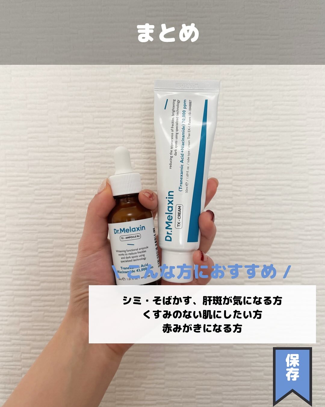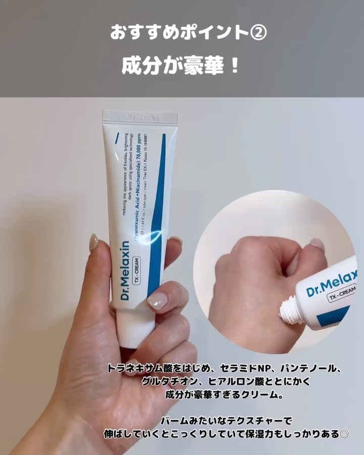 Dr.MelaxinのTXシリーズはシミの飲み薬や注射に使用されるトラネキサム酸配合スキンケア代表作!!! ナノトラネキサム酸でより浸透しやすく べたつかないさらっとテクスチャ一で季節を問わず年中使用できそう◎ クリームにしてはさっぱりした軽めの印象なのでベタつきが苦手の方にはすごくおすすめクリームです☝️