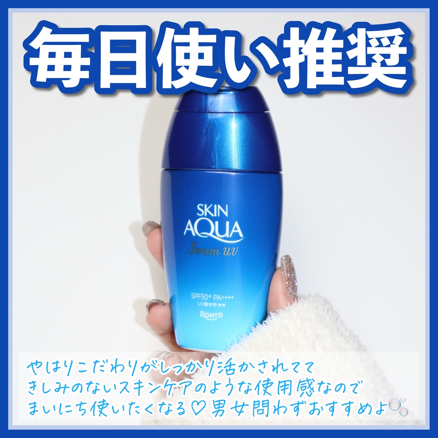 - エタノールフリーで心地よい使用感を実現。最高濃度※1の3種のヒアルロン酸※2配合。 水のようなつけ心地でうるおってもちっとした肌に。 使いやすいワンタッチキャップ。 SPF50+/PA++++/UV耐水性★★。 ※1:スキンアクアシリーズ内において ※2:うるおい成分:ヒアルロン酸Na、超低分子ヒアルロン酸(加水分解ヒアルロン酸Na)、肌吸着型ヒアルロン酸(ヒアルロン酸ヒドロキシプロピルトリモニウム)