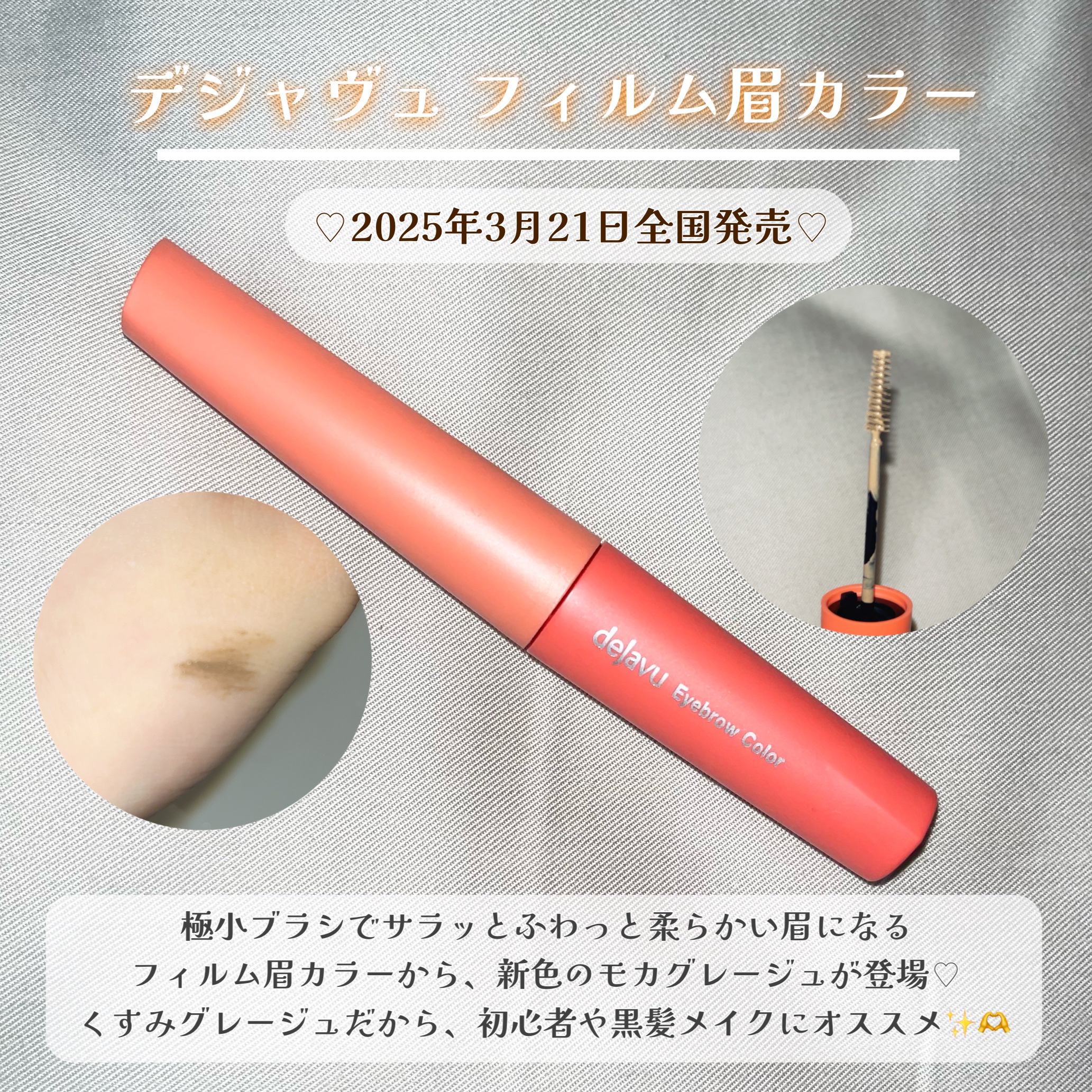 - \\25年3月定番新色モカグレージュ発売// 「フィルム眉カラー」なら眉の印象を自然にやわらげ、ふんわり質感の垢抜け眉に! 1.塗りやすい極小ブラシ ・ 先端直径3mmで、地肌に液がつきにくく根元から色づける ・余分な液がつかない設計で、ティッシュオフ不要 2.眉専用フィルム液 ・眉毛1本1本にキレイに色付き、自眉の黒さをやわらげる ・タバになったり、パリッと固まったりせず、まるで自眉のような仕上がり ・皮脂・汗・こすれに強いのにお湯で簡単オフ (※2025年9月以降、商品パッケージをリニューアル。)
