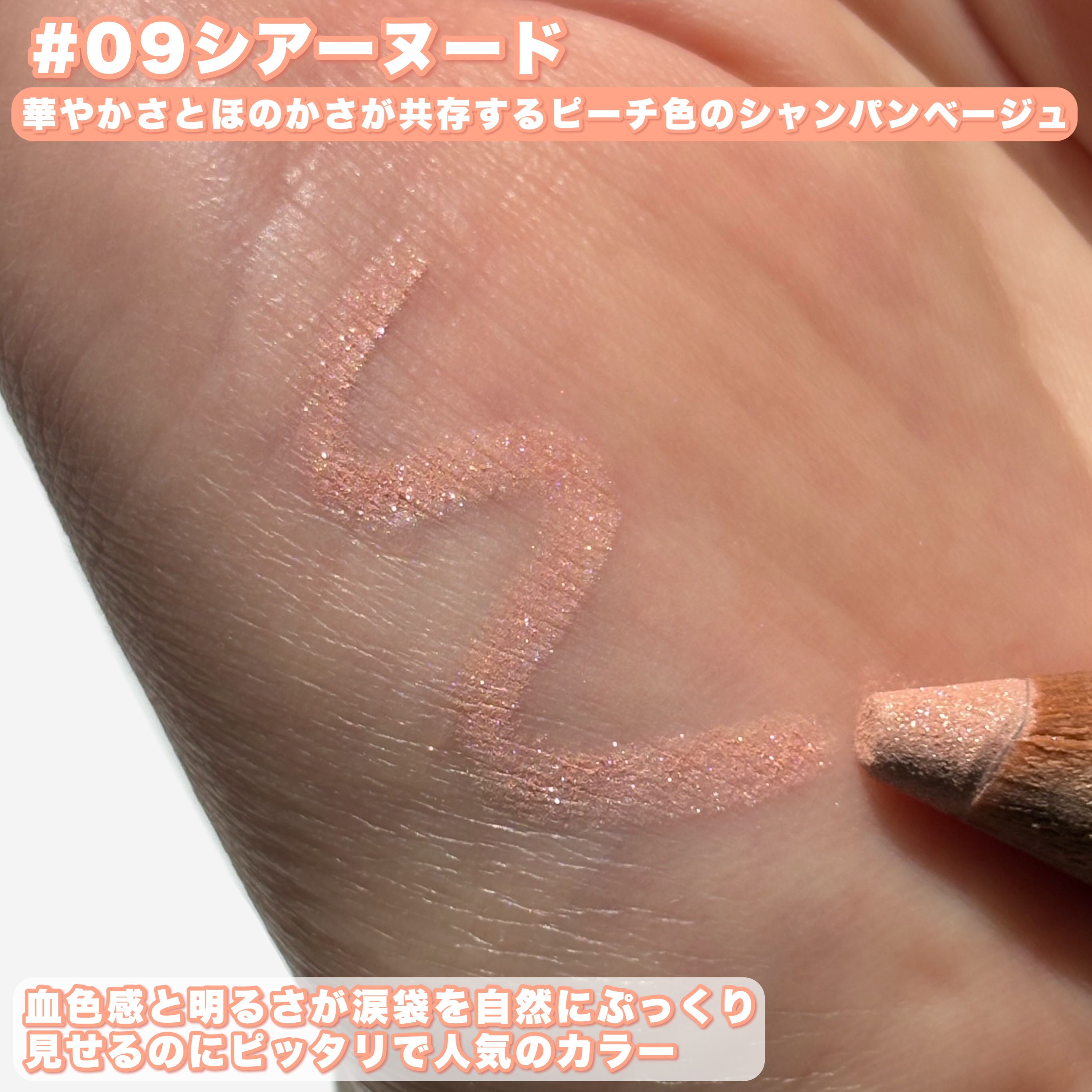 総販売数100万個突破したペンシルです✨ 涙袋やアイシャドウ、チークなどに使用できます! ナチュラルに涙袋が盛れました☺️ 様々なカラーがありますが、09 シアヌードのカラーは1番肌馴染みが良いのではと感じています! コスパ面も良き😳👏