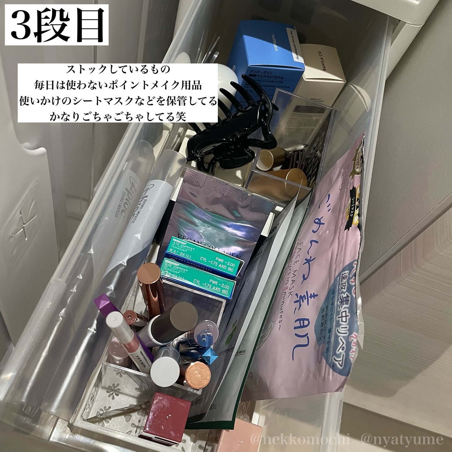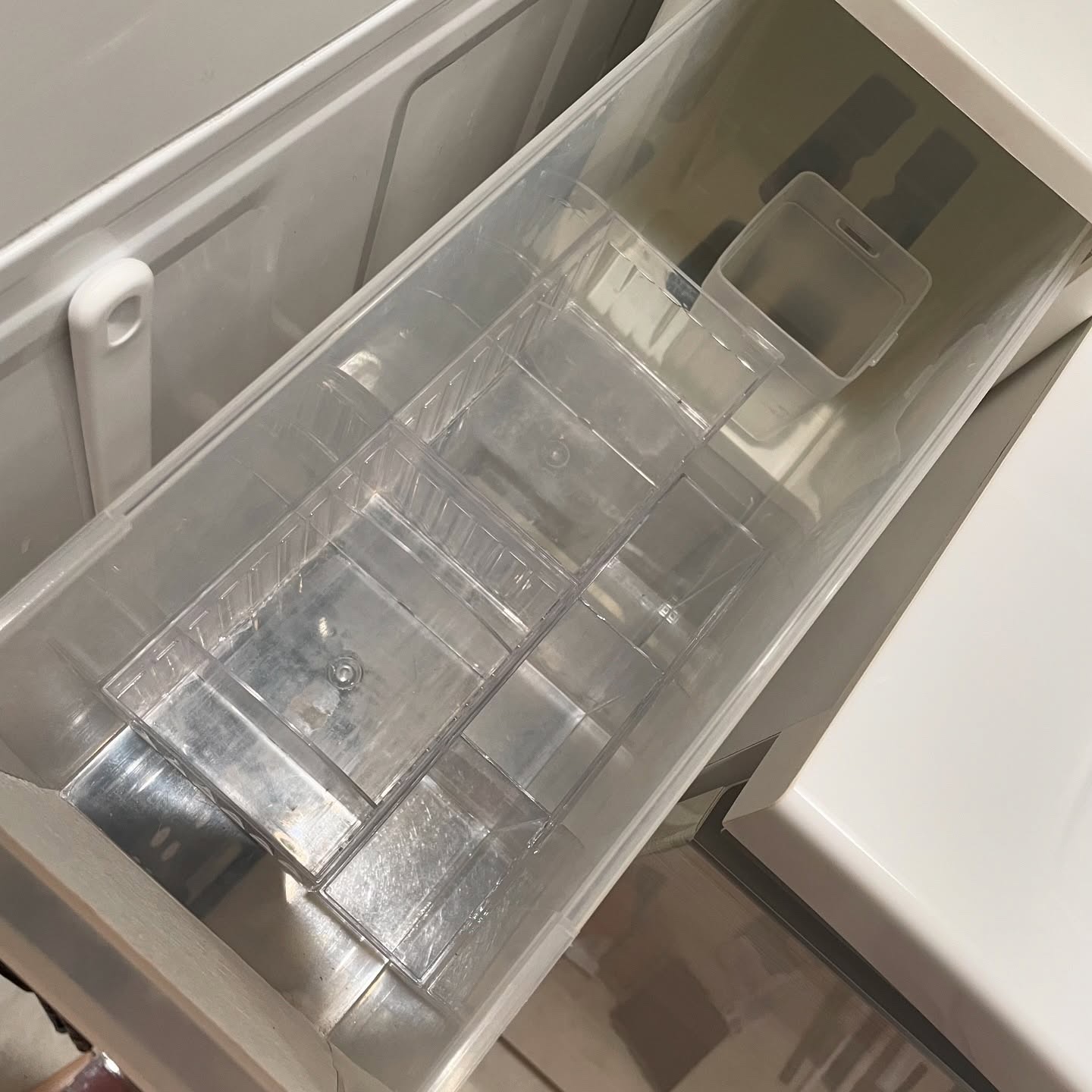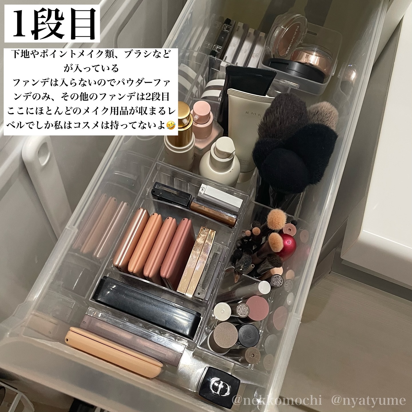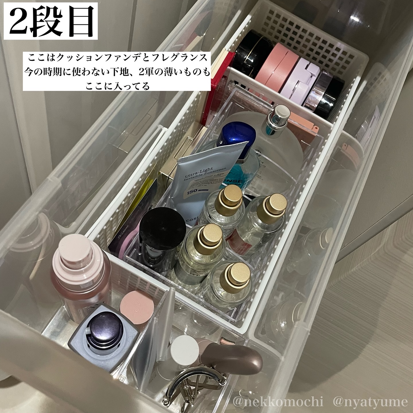 DAISO仕切りケース① ¥110この仕切りケース、クッションファンデを入れるのにぴったりでお気に入りです。仕切り板が2枚入っているので、好きな幅にに調節可能です✨縦向きに置いて使っています!出し入れも簡単で見栄えがいいのでお気に入りです♡#...