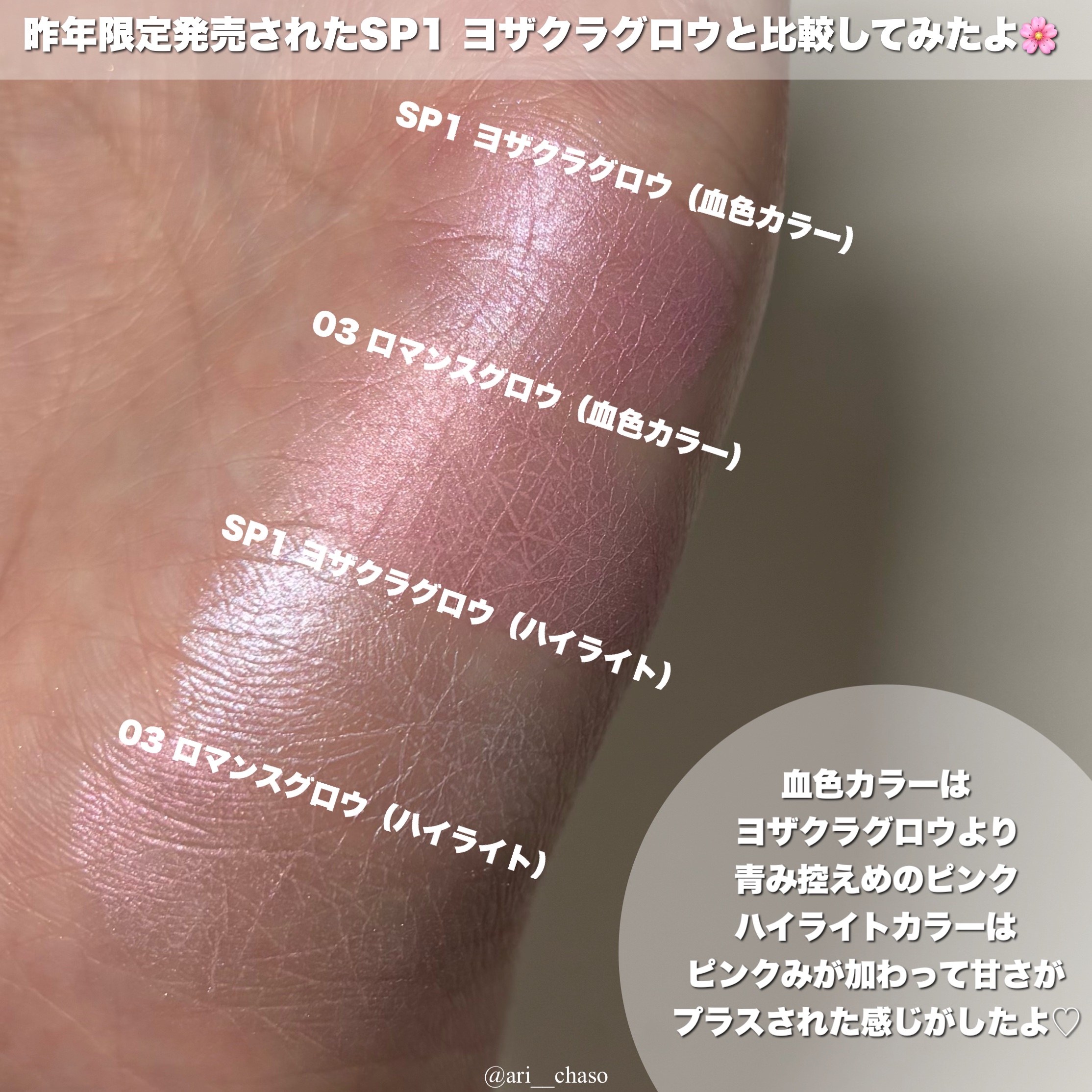 CEZANNEのパールグロウハイライト 今回の限定色はSP2 ロマンスブルーム💐 もうこれ超可愛い💘 770円で、ハイライト4つ買えたみたいなもんだよね💎 混ぜても可愛いし、4色もそれぞれ可愛くて買って大正解🥰