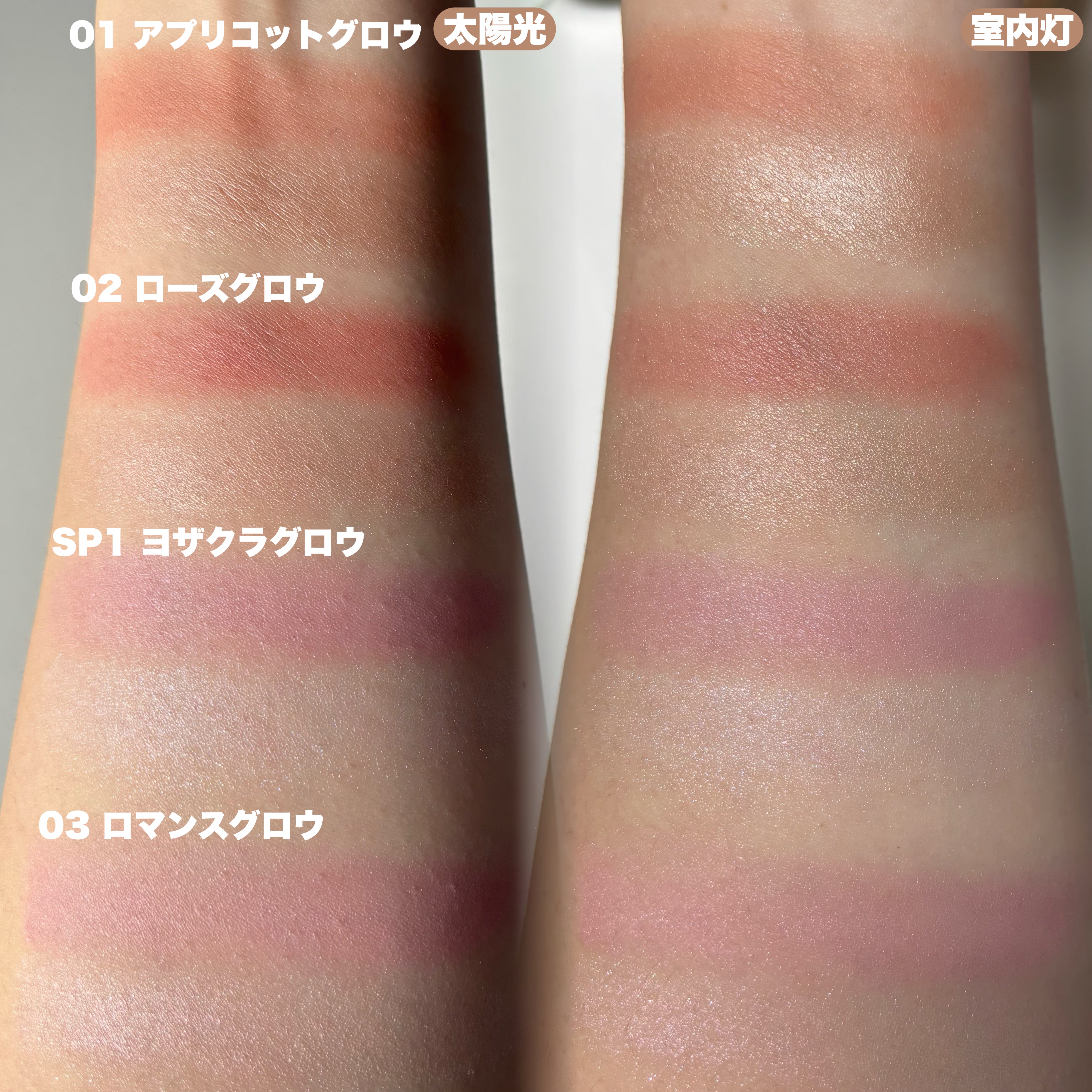- <01 アプリコットグロウ> トリエチルヘキサノイン、ジメチコン、合成フルオロフロゴパイト、(ジメチコン/ビニルジメチコン)クロスポリマー、リンゴ酸ジイソステアリル、シリカ、窒化ホウ素、マイクロクリスタリンワックス、パラフィン、スクワラン、ホホバ種子油、マンゴー種子脂、ヒマワリ種子油、マカデミア種子油、ヤシ油、セラミドNP、ローズマリー葉エキス、アロエベラ葉エキス、加水分解コラーゲン、フェノキシエタノール、トコフェロール、メチルパラベン、タルク、マイカ、酸化チタン、酸化鉄、赤226、コンジョウ、水酸化Al、酸化スズ <02 ローズグロウ> トリエチルヘキサノイン、ジメチコン、合成フルオロフロゴパイト、(ジメチコン/ビニルジメチコン)クロスポリマー、リンゴ酸ジイソステアリル、シリカ、窒化ホウ素、マイクロクリスタリンワックス、パラフィン、スクワラン、ホホバ種子油、マンゴー種子脂、ヒマワリ種子油、マカデミア種子油、ヤシ油、セラミドNP、ローズマリー葉エキス、アロエベラ葉エキス、加水分解コラーゲン、フェノキシエタノール、トコフェロール、メチルパラベン、タルク、マイカ、酸化チタン、酸化鉄、赤226、コンジョウ、水酸化Al、酸化スズ、赤202 <03 ロマンスグロウ> トリエチルヘキサノイン、ジメチコン、合成フルオロフロゴパイト、(ジメチコン/ビニルジメチコン)クロスポリマー、リンゴ酸ジイソステアリル、シリカ、窒化ホウ素、マイクロクリスタリンワックス、パラフィン、スクワラン、ホホバ種子油、マンゴー種子脂、ヒマワリ種子油、マカデミア種子油、ヤシ油、セラミドNP、ローズマリー葉エキス、アロエベラ葉エキス、加水分解コラーゲン、フェノキシエタノール、トコフェロール、メチルパラベン、タルク、マイカ、酸化チタン、酸化鉄、赤226、コンジョウ、水酸化Al、酸化スズ、赤202 <SP1 ヨザクラグロウ> トリエチルヘキサノイン、ジメチコン、合成フルオロフロゴパイト、(ジメチコン/ビニルジメチコン)クロスポリマー、リンゴ酸ジイソステアリル、シリカ、窒化ホウ素、マイクロクリスタリンワックス、パラフィン、スクワラン、ホホバ種子油、マンゴー種子脂、ヒマワリ種子油、マカデミア種子油、ヤシ油、セラミドNP、ローズマリー葉エキス、アロエベラ葉エキス、加水分解コラーゲン、フェノキシエタノール、トコフェロール、メチルパラベン、タルク、マイカ、酸化チタン、酸化鉄、赤226、赤202、コンジョウ、グンジョウ、水酸化Al、酸化スズ