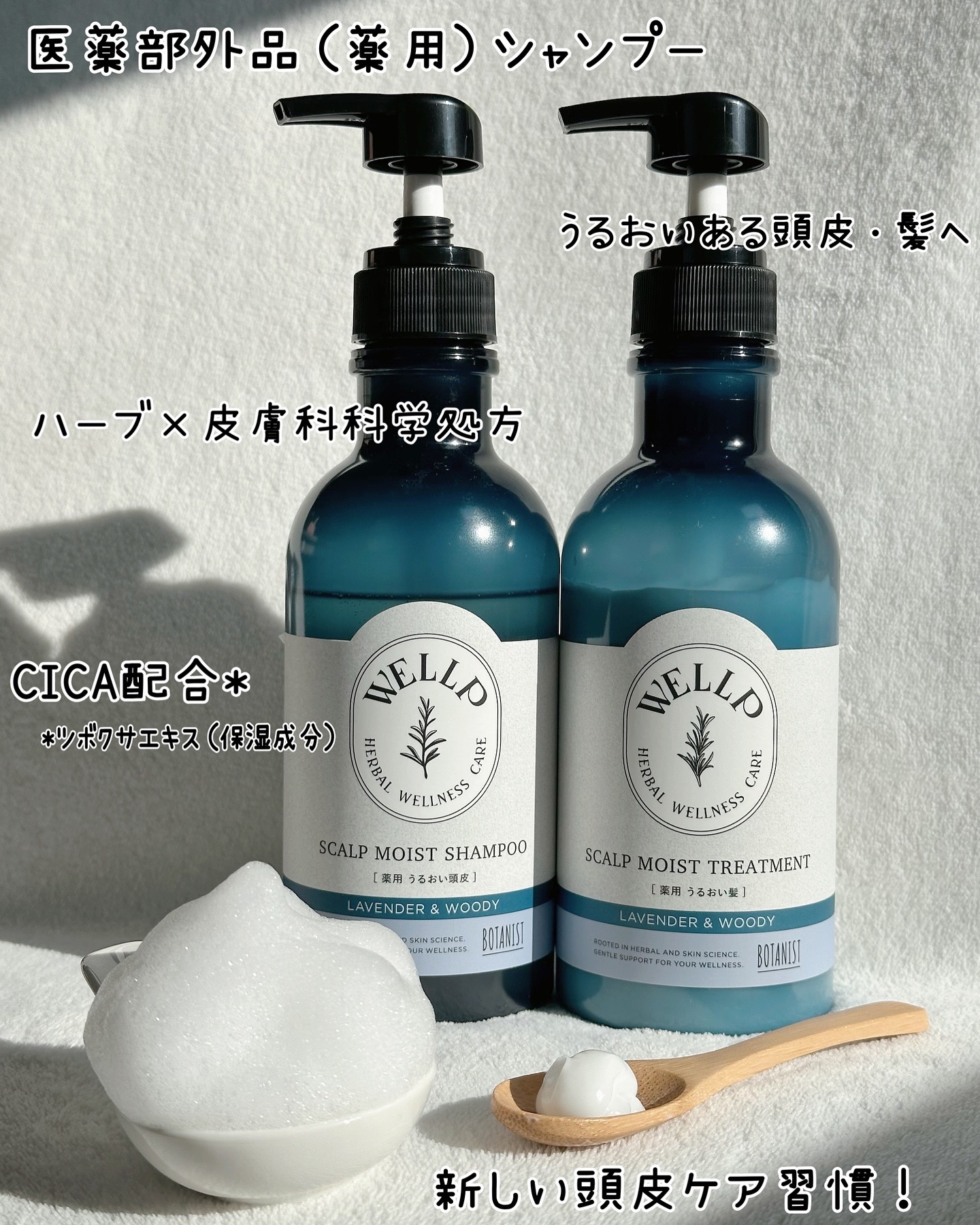 CICA配合※1の薬用シャンプー・トリートメント。WELLP 薬用スカルプケアシャンプー[モイスト] 370ml 1,540円(税込)WELLP 薬用スカルプケアトリートメント[モイスト] 370g 1,540円(税込)《特徴》✴︎ハーブ×皮...