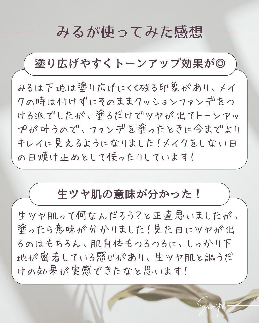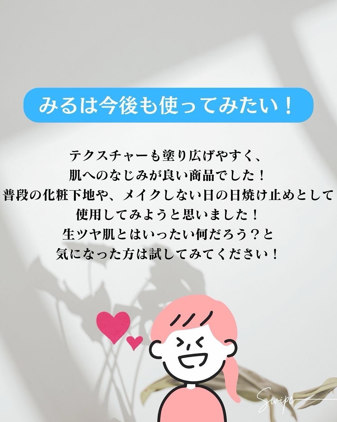 生ツヤ肌✨ ほんのりローズピンクなカラーが白浮きしにくく自然と肌色に馴染んでくれるから使いやすい😊 特にツヤ感が欲しい部分の頬骨とか目の下あたりは、光が反射しやすい部分だからとってもキレイに見えますよ💖 SPF50+・PA++++ 入っているから嬉しい☀️