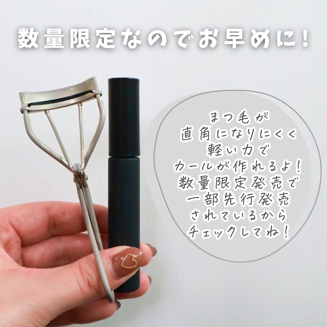 まつ毛の根もとのカーブにぴたっとフィットする形状で、まつ毛全体を根もとからキャッチし、しっかりカールアップ。 エテュセ アイラッシュカーラーでまつ毛をカールした後、エテュセアイエディション(マスカラベース)を使えば、根もとからくるんとカールしたキレイなまつ毛に仕上がります。 さすが殿堂入りの名品ですね👑 全体的にブラックのパケ。開けたらコームタイプのブラシで、とても塗りやすい💫