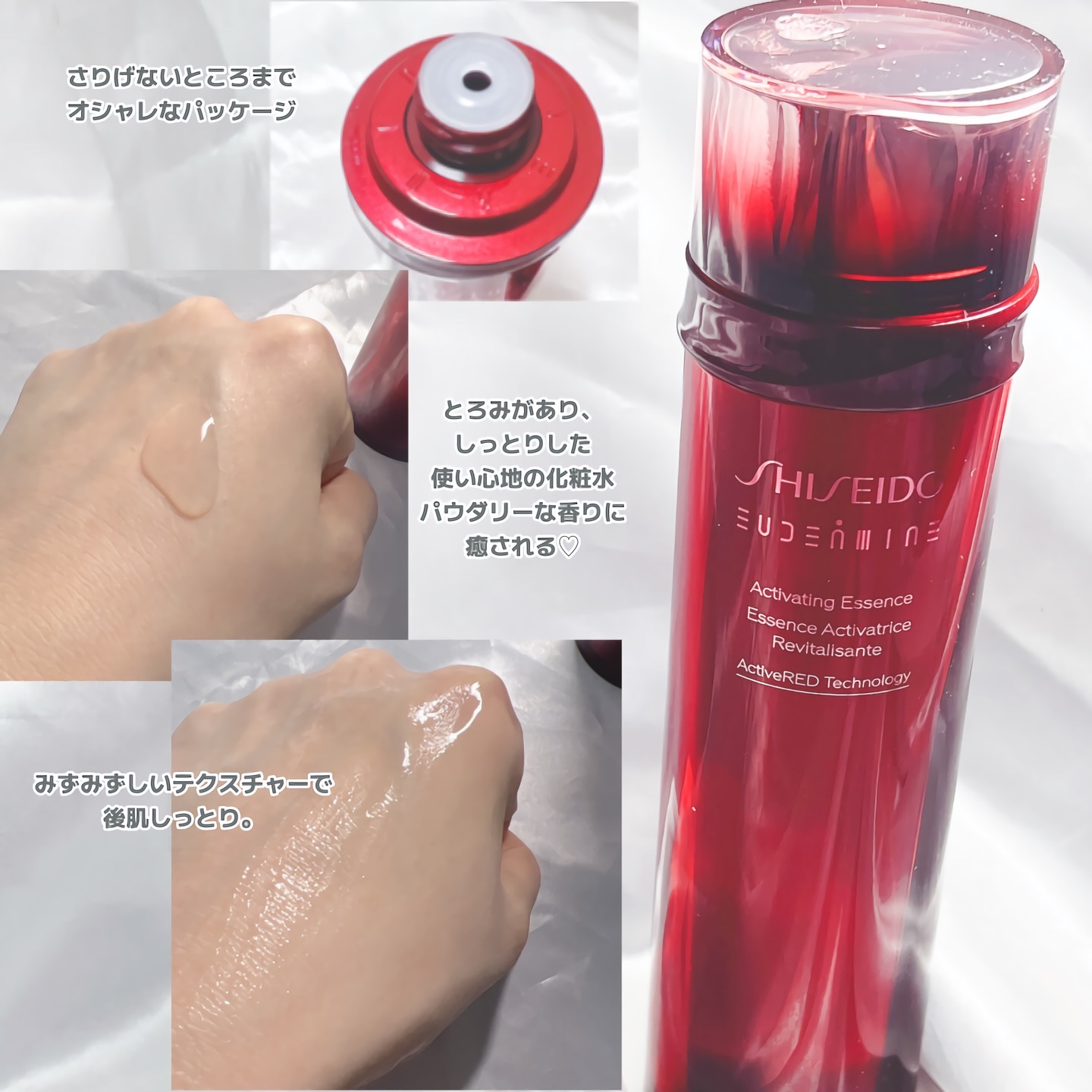 再生。新生 SHISEIDO オイデルミン誕生。 透明感あふれる輝き、ハリ・弾力、なめらかさが整った状態に導く、エッセンスローション。 濃厚ながらみずみずしく、流れるような強すぎないとろみのテクスチャー。 不要な角質のケアも期待でき、500円玉大を目安にコットンで馴染ませるのがおすすめとのこと。 使い心地も良く、化粧水だけとは思えないような満足感のある使い心地でお気に入り!