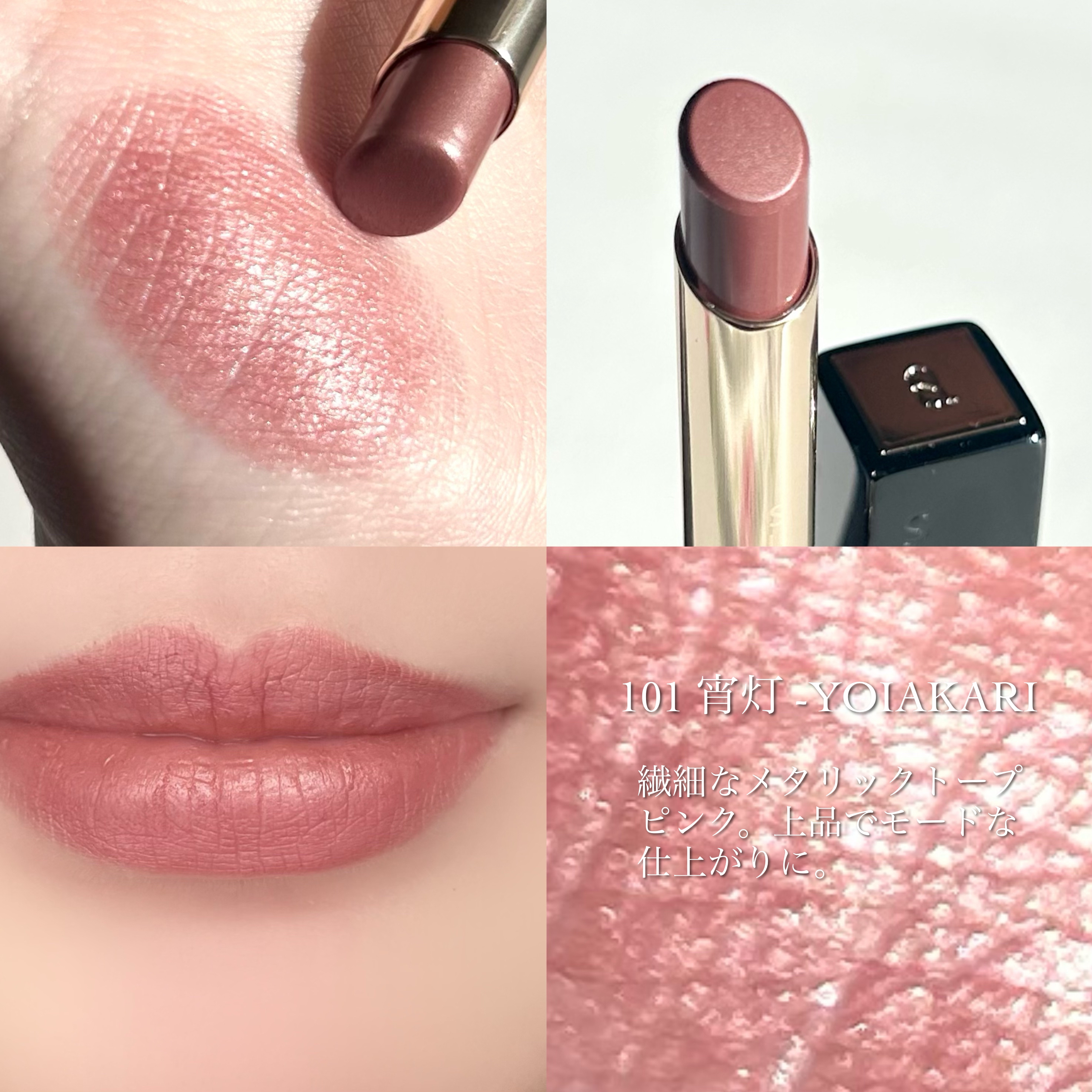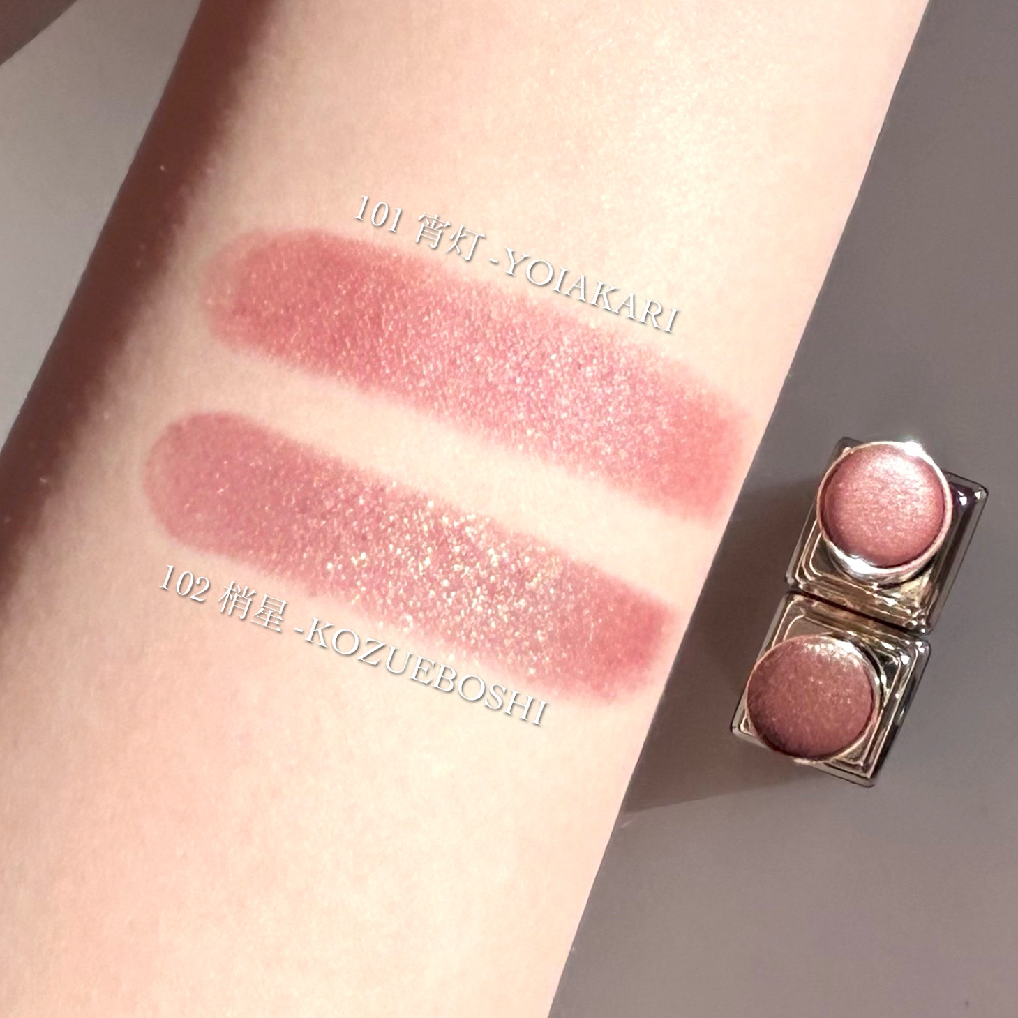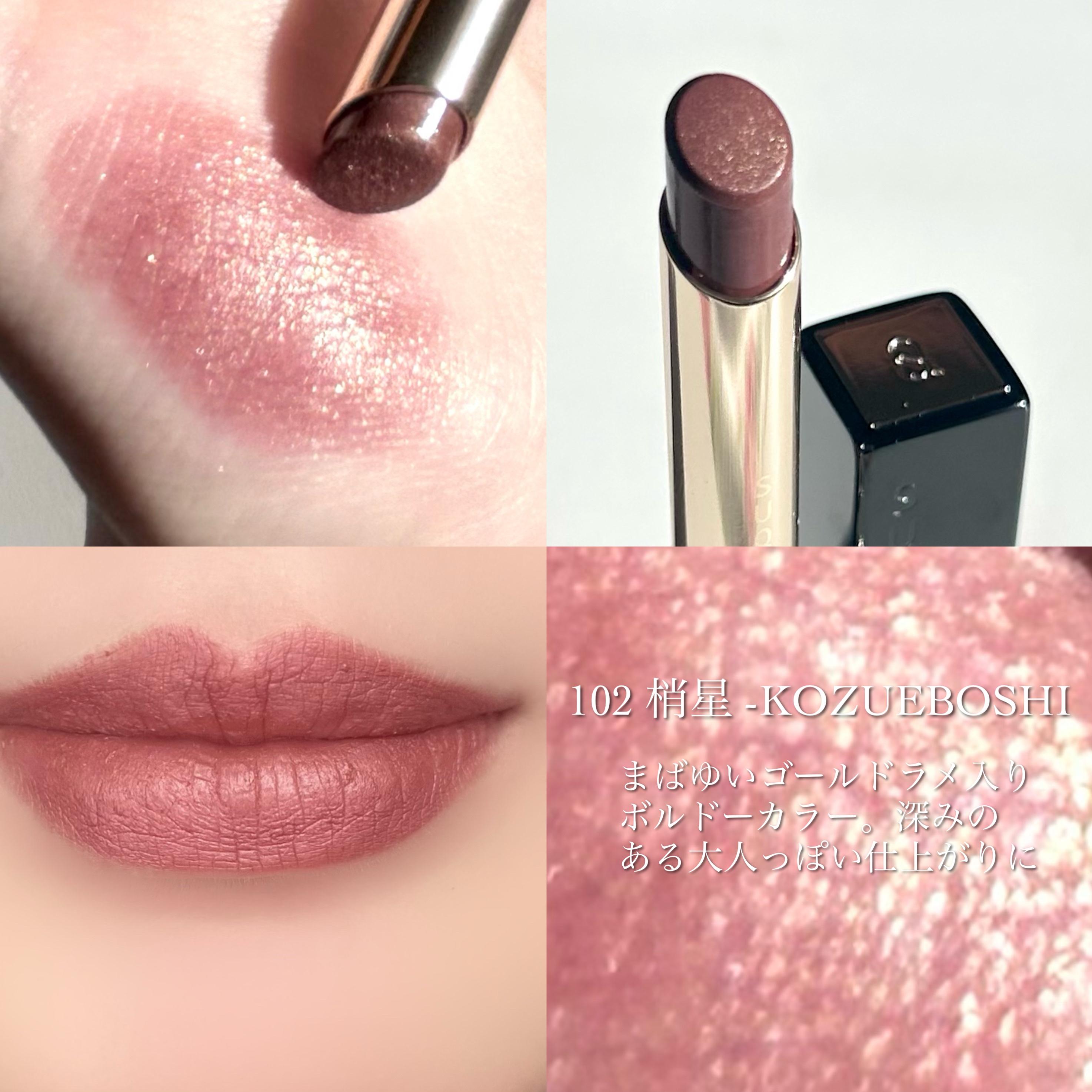 シャイニーでメタリックなトープピンク まばゆいゴールドラメが零れ落ちるシャインウッド。花屏風の鈍い輝きを想起させる端正なカラー。 運良く限定色を購入できたので比較してみました💡こうやって並ぶと全然違うし、それぞれがほんと美しい発色🫶 可愛らしい色が好きな方は101、ラメ感が強いのがお好きな方は102を選んだのが多かったのかなぁと思いました!