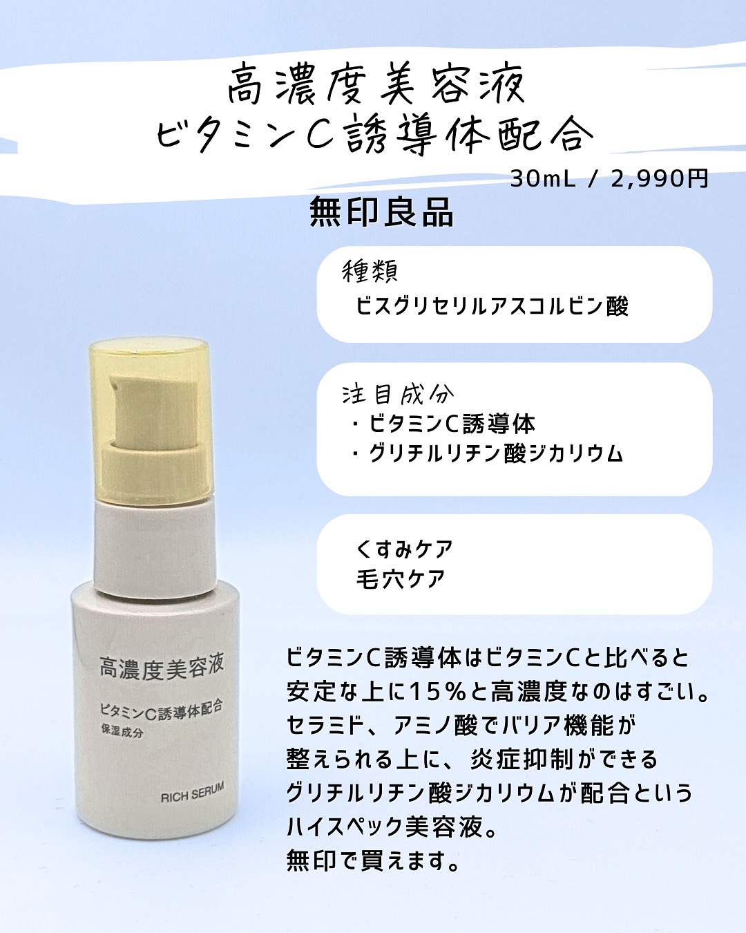 肌が荒れた時にビタミンCがいいとSNSで見かけたというフォロワーさんがいたけど、これは本当に辞めてほしい(濃度にもよるけど) ビタミンCは攻めのケアでもあるから、肌が敏感な時には避けてほしい。 でも、メラニン予防とか毛穴ケアには本当に良い商品でもあると思うから、使い方を間違えずに選択してほしいな!!