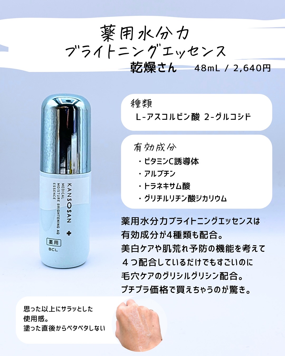 特定の有効成分を試してみたい。美容成分を試したい。そんな時は代用してもいいけど、それって似てるのかな?って思うときが正直ある。 同じ成分があっても実は濃度が違ったり、処方技術が違ったり。技術が違うと使用感も剤型も変わることがあることは知ったうえで使うといいかも。 せっかくプチプラ化粧品を買うならそれはそれで楽しんでほしいから是非念頭にいれてほしいな!!