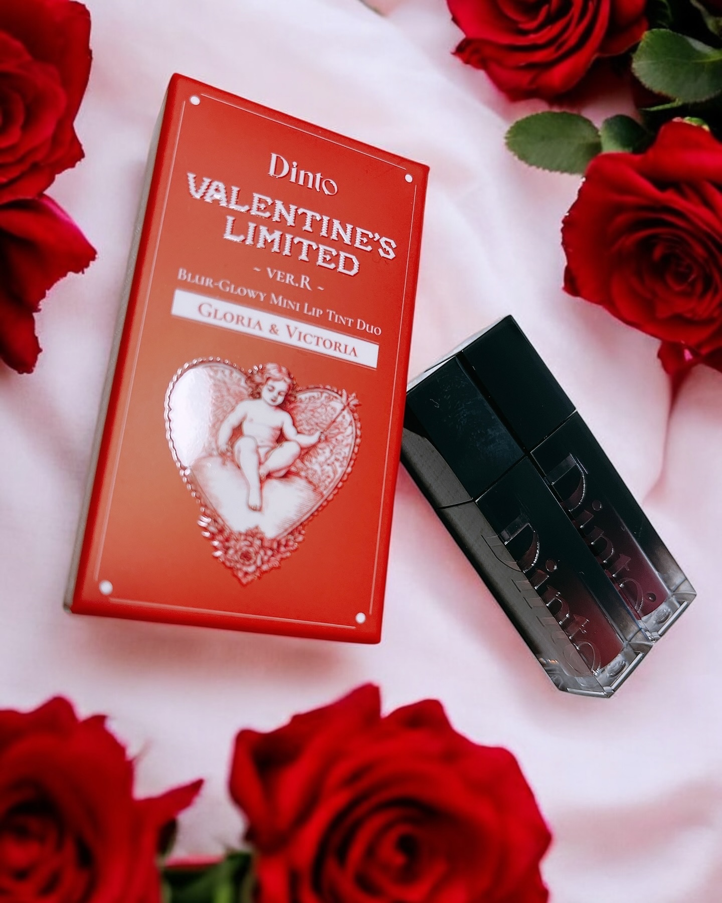 パッケージかわいい&みんな大好きミニサイズ「VALENTINE'S LIMITED Blur-Glowy Mini Lip Tint Duo」です✨ クランベリー果汁が染み込んだ チェリーブルーネット ミルクチョコレートカラー。 ジューシーな付け心地が、Dintoだなあって思いました♥️ しっかり色づいて、でも見た目にはわからないプルっと感が良きなんです。