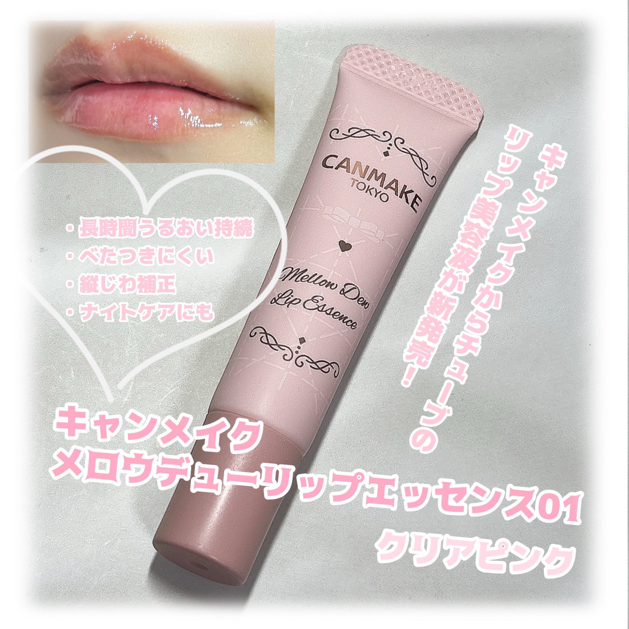 - 2025年7月以降順次定番化! いつでも保湿ケア♡ぷるぷる唇 リップ美容液! メロウデューリップマスクから登場した、いつでも保湿ケアができるチューブタイプのリップ美容液です。 乾燥によるカサつきくすみが気になる唇に!美容液成分96%配合。 【しっとりぷるぷる♪集中保湿ケア】 ・長時間しっとりキープし、うるおい持続。 ・水分蒸散を防ぎ、乾燥から守る。 【べたつきにくい】 【唇の縦ジワ補正※】 ・唇の縦ジワを補正し、ふっくらとハリのある唇に。 ※メイクアップ効果 【ぷっくりグロス効果&ナイトケア】 ツヤ感をプラスして、リップグロスとして使える♪ たっぷり塗ればナイトケアにも! 【唇の荒れを防ぐ】 ★美容保湿成分配合★ グリチルレチン酸ステアリル、セラミドNP、トコフェロール、ピリドキシンHCl、パンテノール 【細めの斜めカットチューブ】 唇にフィットし、はみ出さずに塗りやすい。持ち運びしやすく、日中のお出かけにも♡