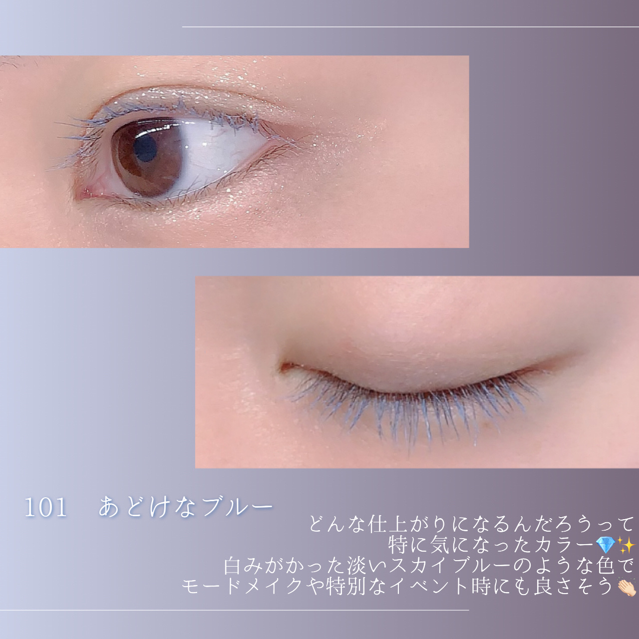 明るく、軽く、愛らしい限定3色! マットで粘り気の強い仕上がりかも。 明るさは私的には🩵水色(明るい)>🩷ピンク>💜紫(暗い)って感じで、ブルベ冬なので個人的に一番落ち着いてる紫がドンピシャ! 黒マスカラよりアンニュイだけど黒い毛とも自然に馴染むカラーマスカラで上品に仕上がった!