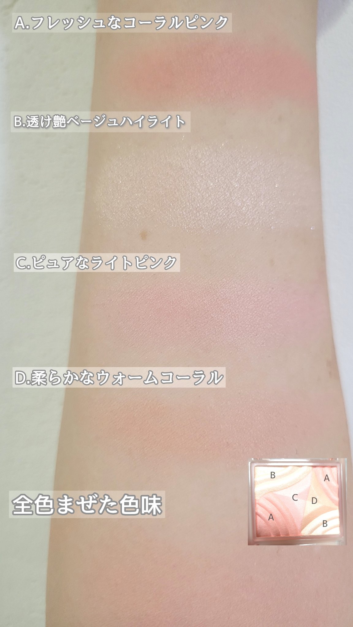 - 印象をコーディネートするグラデーションチーク。 3色のマットカラーと1色のパールカラーが1つに。混ぜ方次第で艶チークもマットチークも自由自在につくれます。 ※ブラシはよくふき取ってからご使用ください。 美容保湿成分(ヒアルロン酸Na、オリーブ果実油、バオバブ種子油)配合。 肌あたりの良い毛量たっぷりのブラシ付き