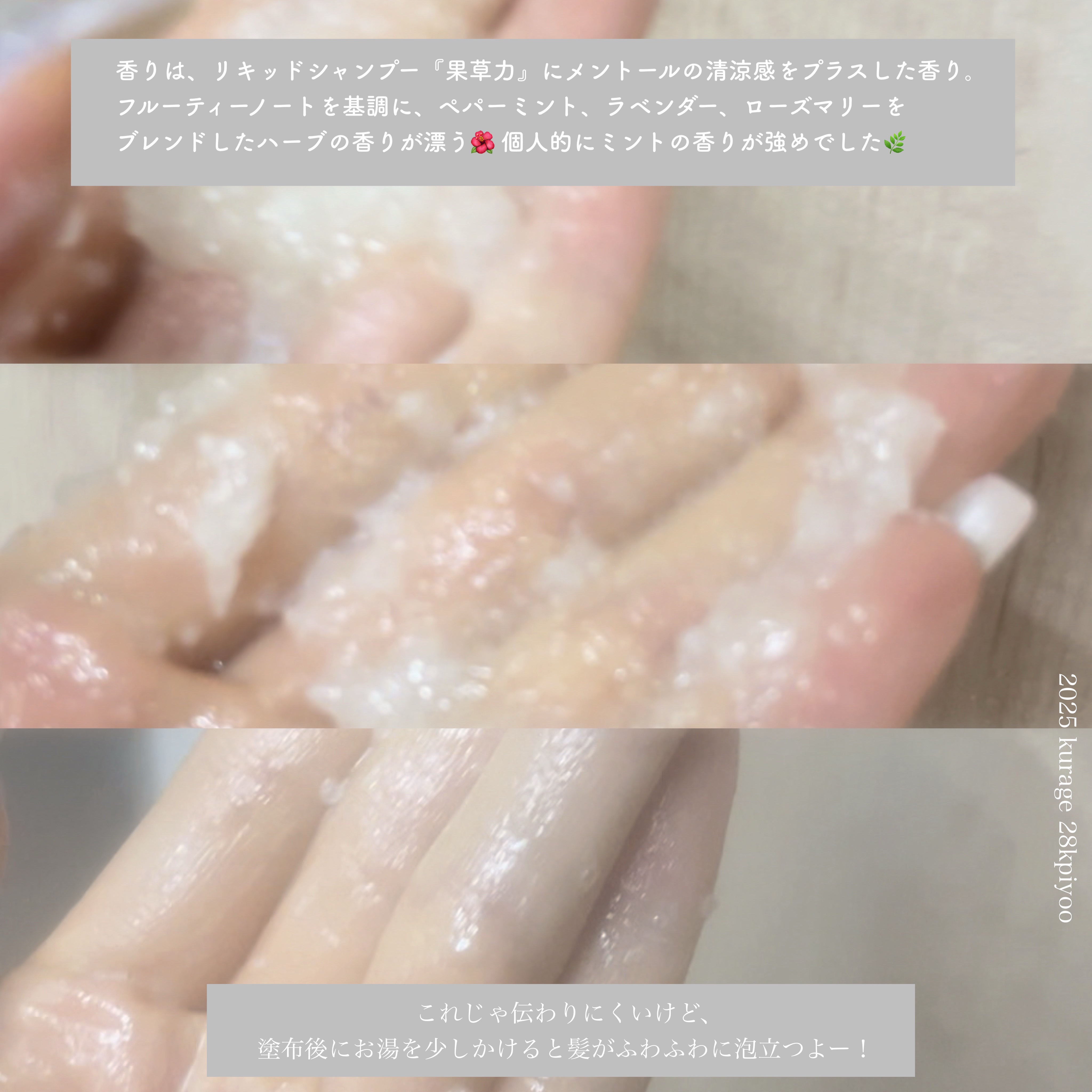 - ラッシュの人気シャンプー『果草力』をベースに、シーソルトを加えることで、フレッシュな香りのミントが爽快感を与える、スクラブ感のあるリキッドシャンプーが誕生しました。 タンパク質分解酵素を含むパパイヤ、パイナップル、キウイ果汁が頭皮に残る余分な皮脂や古い角質の洗浄をサポートします。また、髪をやわらかくしてくれるホホバオイル、オリーブオイル、アーモンドオイルが髪の潤いを保ち、切れ毛になりにくい髪に導きます。 ミントの香りで洗い上がりは爽快感を感じられます。 <香り>メントールの清涼感とフレッシュな香り