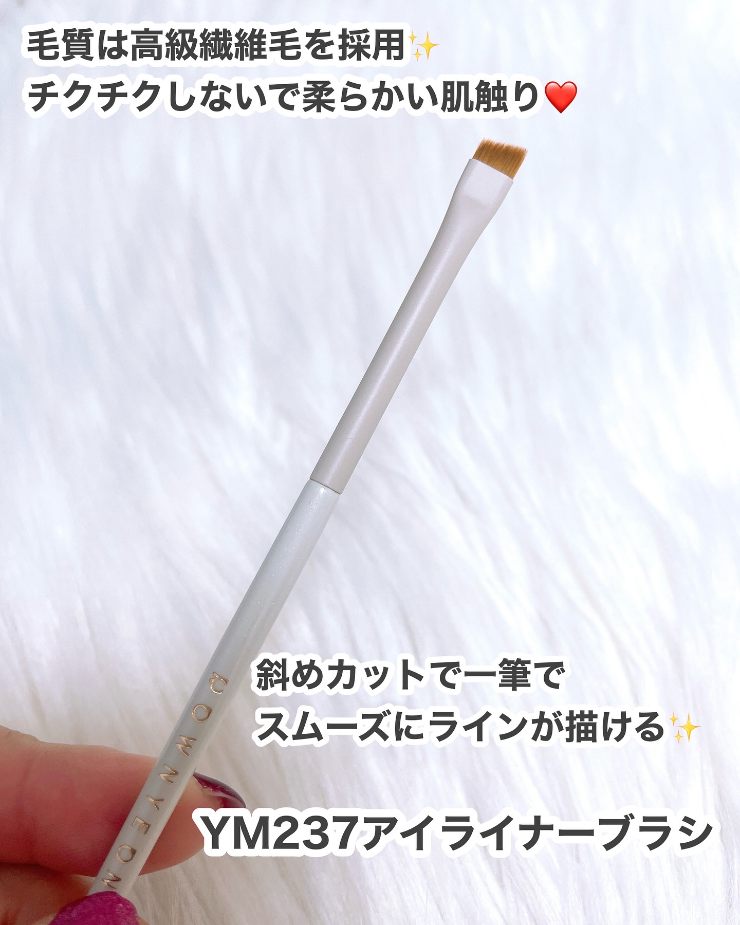 専用のブラシを使ってメイクするとメイクのクオリティがワンランクUP😆 持ち手が長くて柔らかい肌触りのブラシで使いやすいよ💓 毛質は高級繊維毛 動物毛ではなく人工毛なので水洗いしやすく、いつも衛生的に保てる 持ち手の長さが長めで持ちやすい ナチュラルで繊細なラインがキレイに引ける