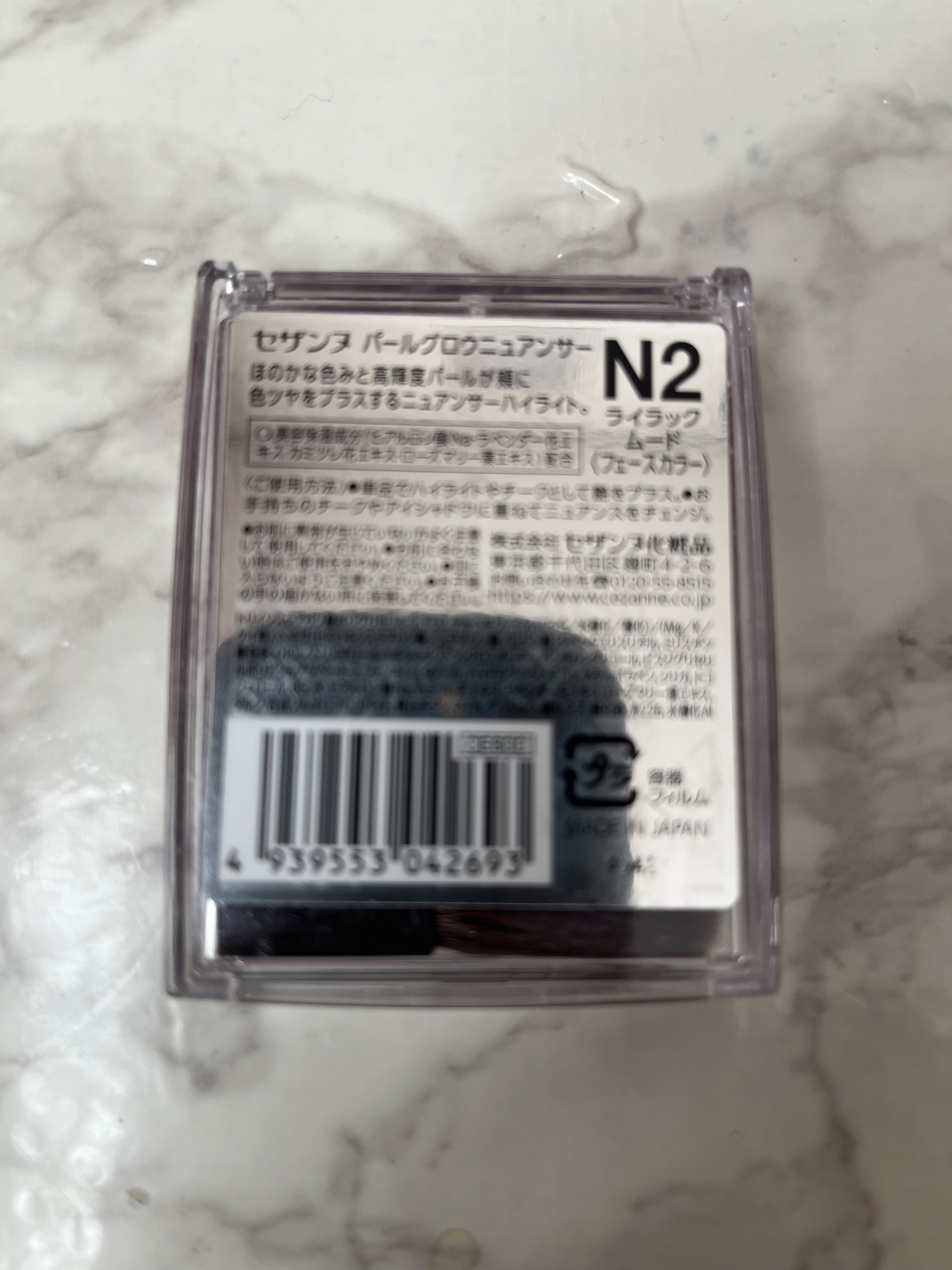 - <N1 コーラルシャワー> トリイソステアリン酸ポリグリセリル-2、トリエチルヘキサノイン、(フッ化/水酸化/酸化)/(Mg/K/ケイ素)、ヘキサ(ヒドロキシステアリン酸/ステアリン酸/ロジン酸)ジペンタエリスリチル、ミリスチン酸亜鉛、(HDI/トリメチロールヘキシルラクトン)クロスポリマー、ペンチレングリコール、ビスジグリセリルポリアシルアジペート-2、フェノキシエタノール、ハイドロゲンジメチコン、メチルパラベン、シリカ、トコフェロール、BG、水、ヒアルロン酸Na、カミツレ花エキス、ラベンダー花エキス、ローズマリー葉エキス、タルク、マイカ、酸化チタン、合成フルオロフロゴパイト、酸化鉄、酸化スズ、赤226、黄4、水酸化Al <N2 ライラックムード> トリイソステアリン酸ポリグリセリル-2、トリエチルヘキサノイン、(フッ化/水酸化/酸化)/(Mg/K/ケイ素)、ヘキサ(ヒドロキシステアリン酸/ステアリン酸/ロジン酸)ジペンタエリスリチル、ミリスチン酸亜鉛、(HDI/トリメチロールヘキシルラクトン)クロスポリマー、ペンチレングリコール、ビスジグリセリルポリアシルアジペート-2、フェノキシエタノール、ハイドロゲンジメチコン、メチルパラベン、シリカ、トコフェロール、BG、水、ヒアルロン酸Na、カミツレ花エキス、ラベンダー花エキス、ローズマリー葉エキス、タルク、合成フルオロフロゴパイト、酸化チタン、マイカ、グンジョウ、酸化スズ、酸化鉄、赤226、水酸化Al