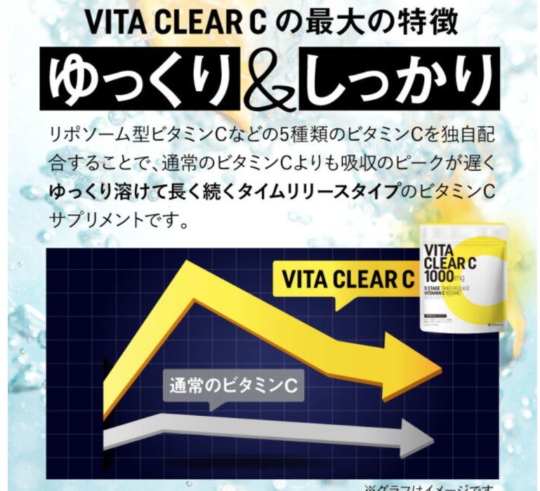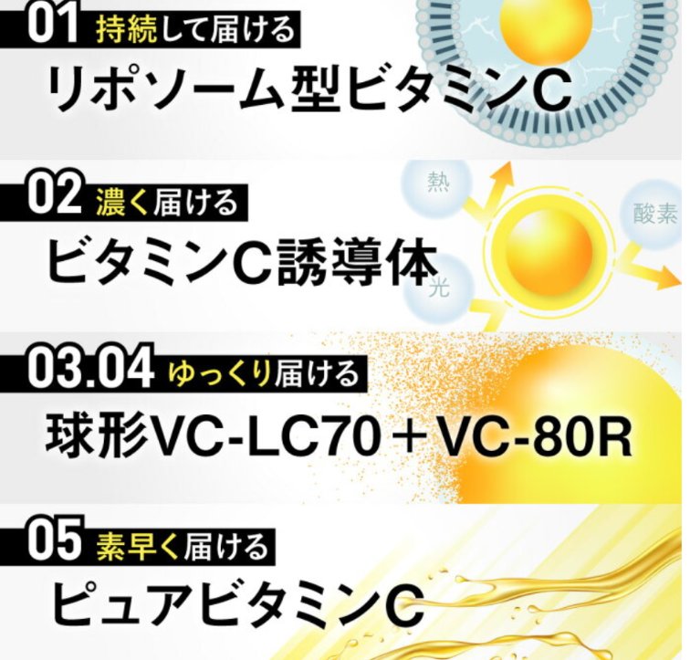 ビタクリアCは5種類のビタミンCを独自配合しています。 リポソーム型ビタミンC (持続して届ける)、ビタミンC誘導体 (濃く届ける)、球形VC-LC70➕VC-80R (ゆっくり届ける)、ピュアビタミンC (素早く届ける) リーズナブルなビタミンCをお探しの方、インナーケアにプラス1品されたい方、良かったらチェックしてみて下さいね🥰