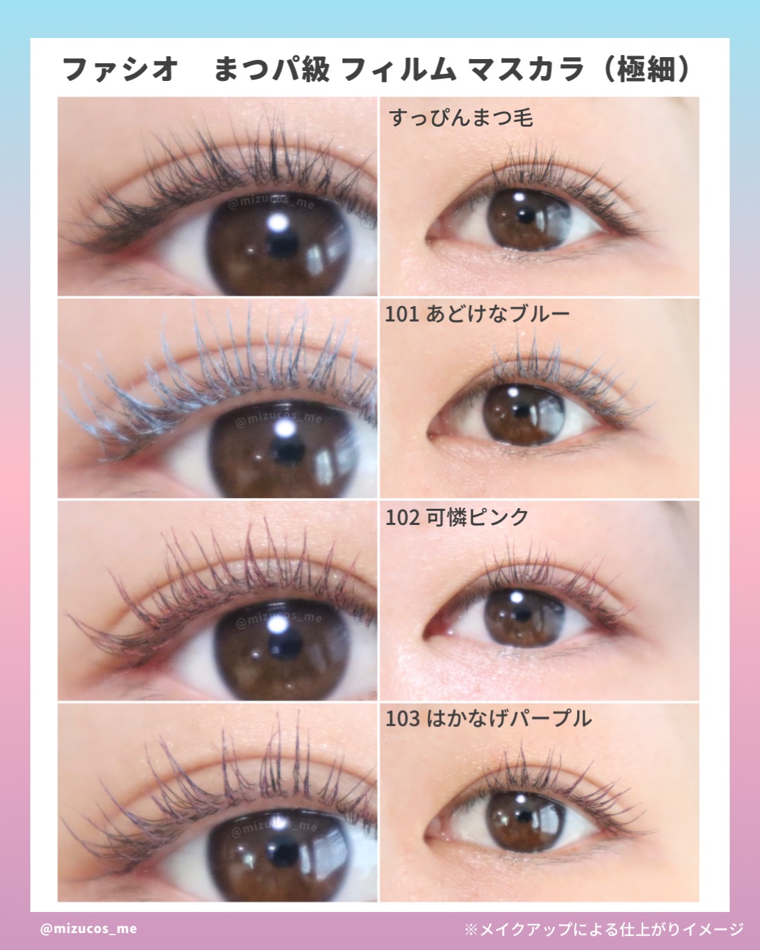 カスミ草ブーケのような限定色 101あどけなブルー / 102可憐ピンク / 103はかなげブルー が2/16に数量限定発売✌🏻 極細マスカラで塗りやすく、まつ毛一本一本綺麗にキャッチしてセパレートしてくれる🫡 カールキープ力もあって、涙ストロング成分で滲みにも強い。この3色の中では103はかなげパープルが普段使いしやすいよ☺️👏🏻