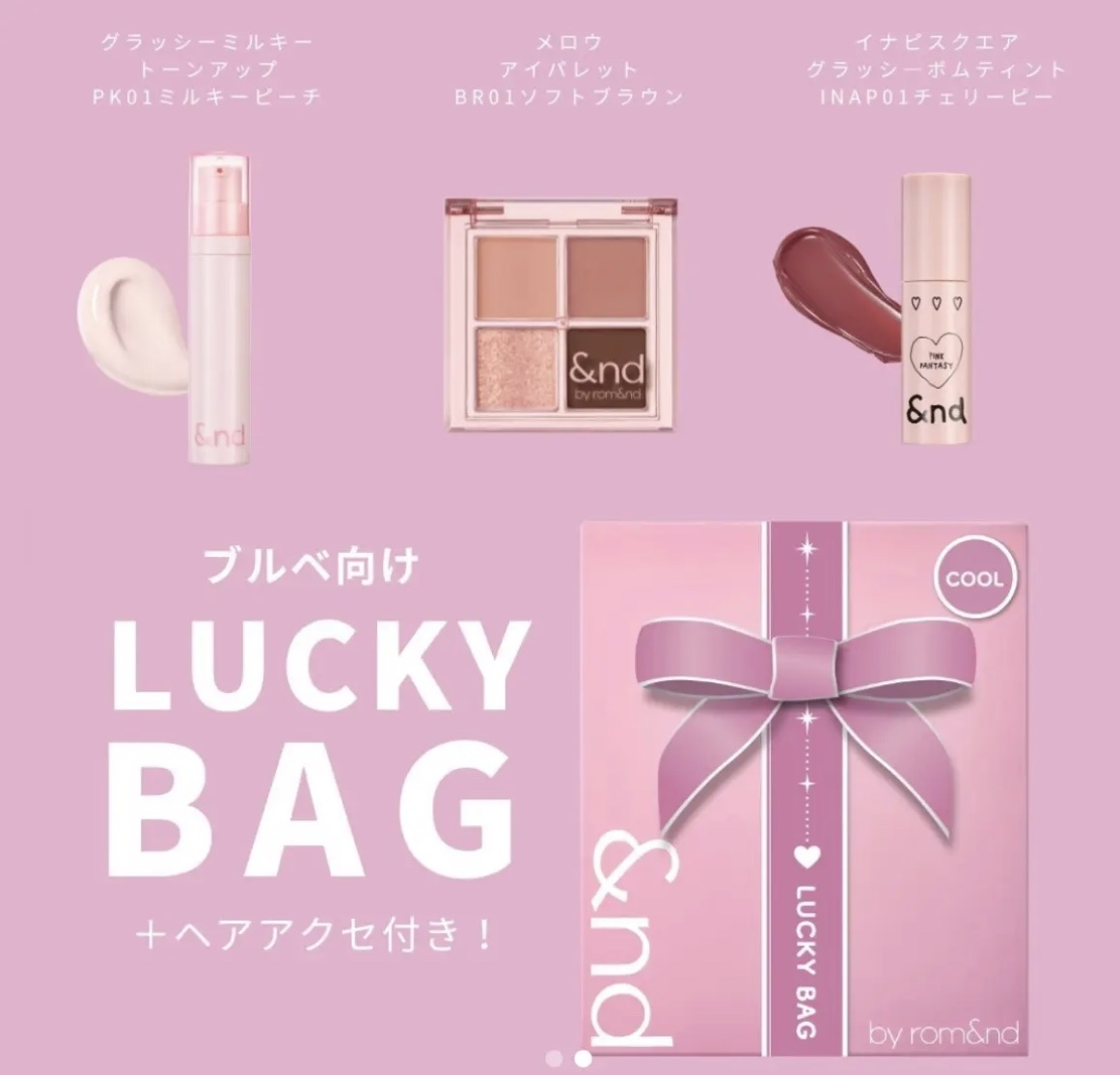 『アンドバイロムアンド』から登場した福袋「ラッキーバッグ」は2種類。パーソナルカラー別に、イエベ用、ブルべ用が用意されています! 化粧下地「グラッシーミルキートーンアップ/PK01ミルキーピーチ」はSPF50+・PA++++の紫外線カットを備えた化粧下地。トーンアップとツヤ感で肌綺麗に見せてくれます。 リップ「イナピスクエアグラッシーボムティント/INAP01チェリーピー」はプリンのようなぷるぷる光沢感が魅力的なティント。