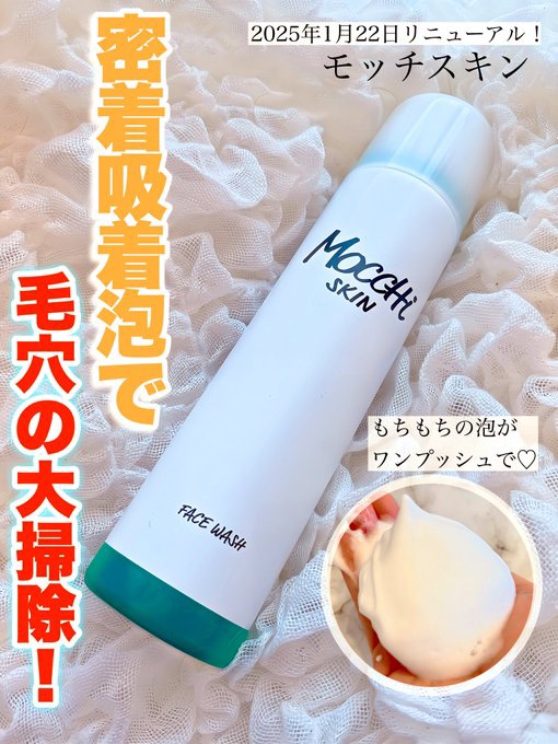 2025年1月22日にリリューアルし、全国のバラエティショップ、ドラッグストア等店頭及び公式オンラインショップで販売開始した#モッチスキン泡洗顔。 ハマメリス・グリチルリチン酸2Kが新配合され洗い上がりのお顔の明るさ・透明感がさらにアップしました。 洗い上がりの好みで選べる、はちみつ配合の「しっとりタイプ」と炭を配合した「さっぱりタイプ」の2種類があり、