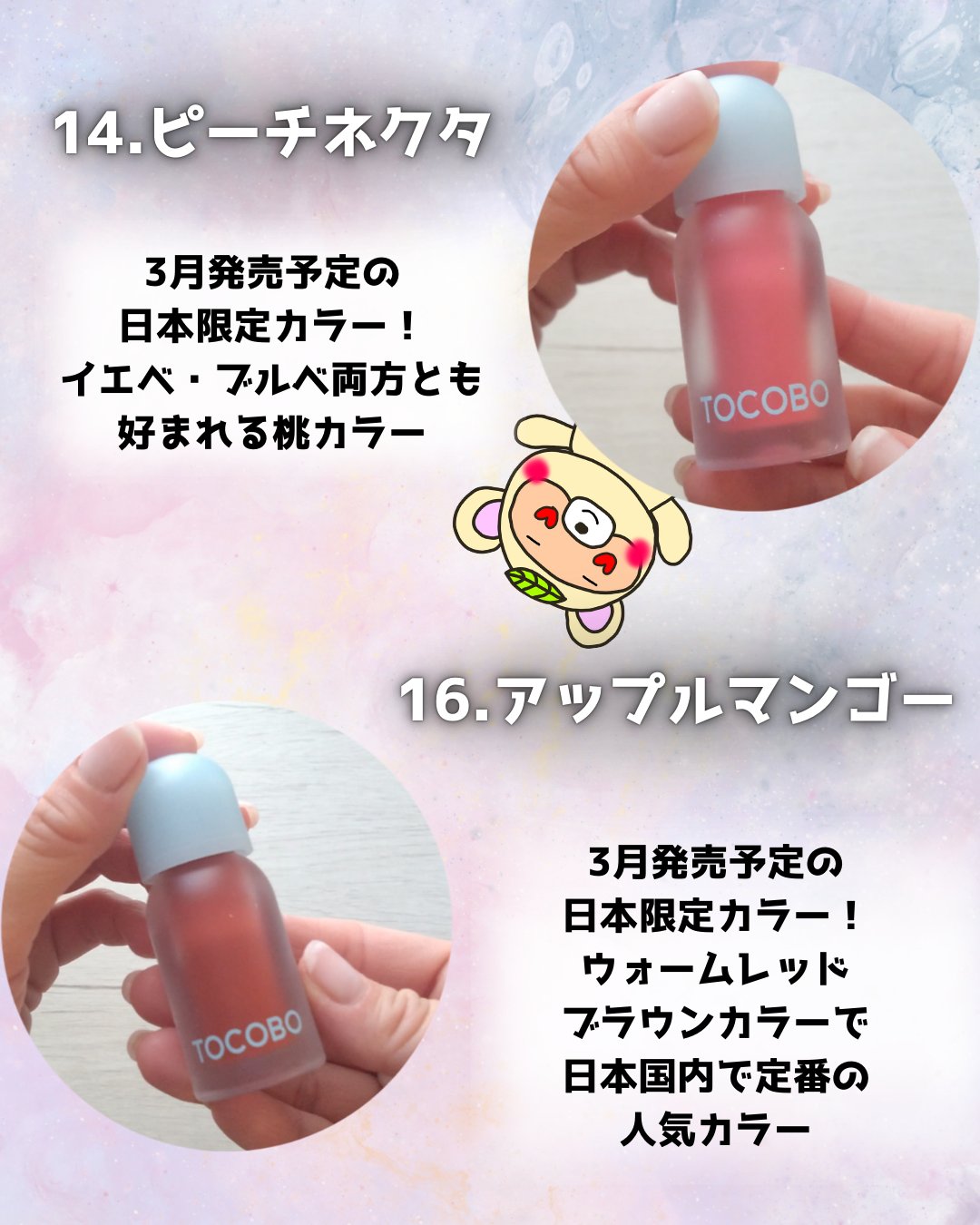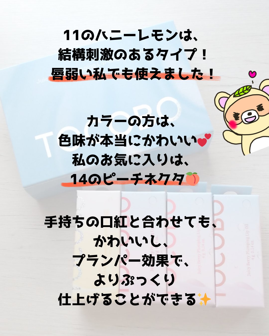ジューシーベリープランピングリップオイル♡ 3月発売予定で日本限定カラーも登場🍑 ぷるぷるのビー玉リップ✨️ - 11ハニーレモン:ラメ入りで可愛い🍋 プランピングMAXタイプ 慣れるまで結構痛い😣 1番透け感のないタイプで、ぷるんと桃唇に✨️ - 16アップルマンゴー:こちらも3月発売予定の日本限定カラー🥭