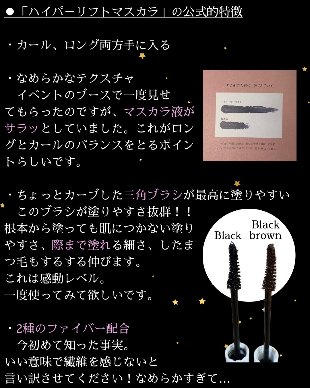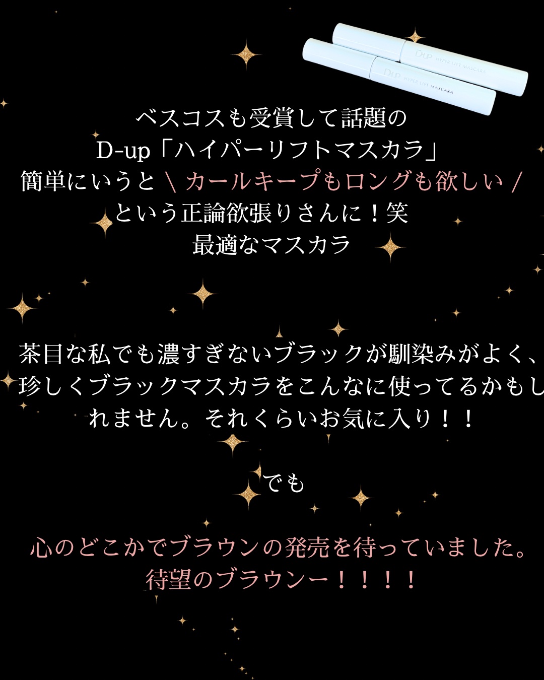 昨年発売され下半期ベスコスを多数受賞したハイパーリフトマスカラより、待望の新色! 今回の新色、ブラウンブラックはブラウンマスカラでも目力が失われない黒の深みも入った濃密な”黒みブラウン” 黒より柔らかいけどしっかり盛れてどんなメイクにも合わせやすいです🤝