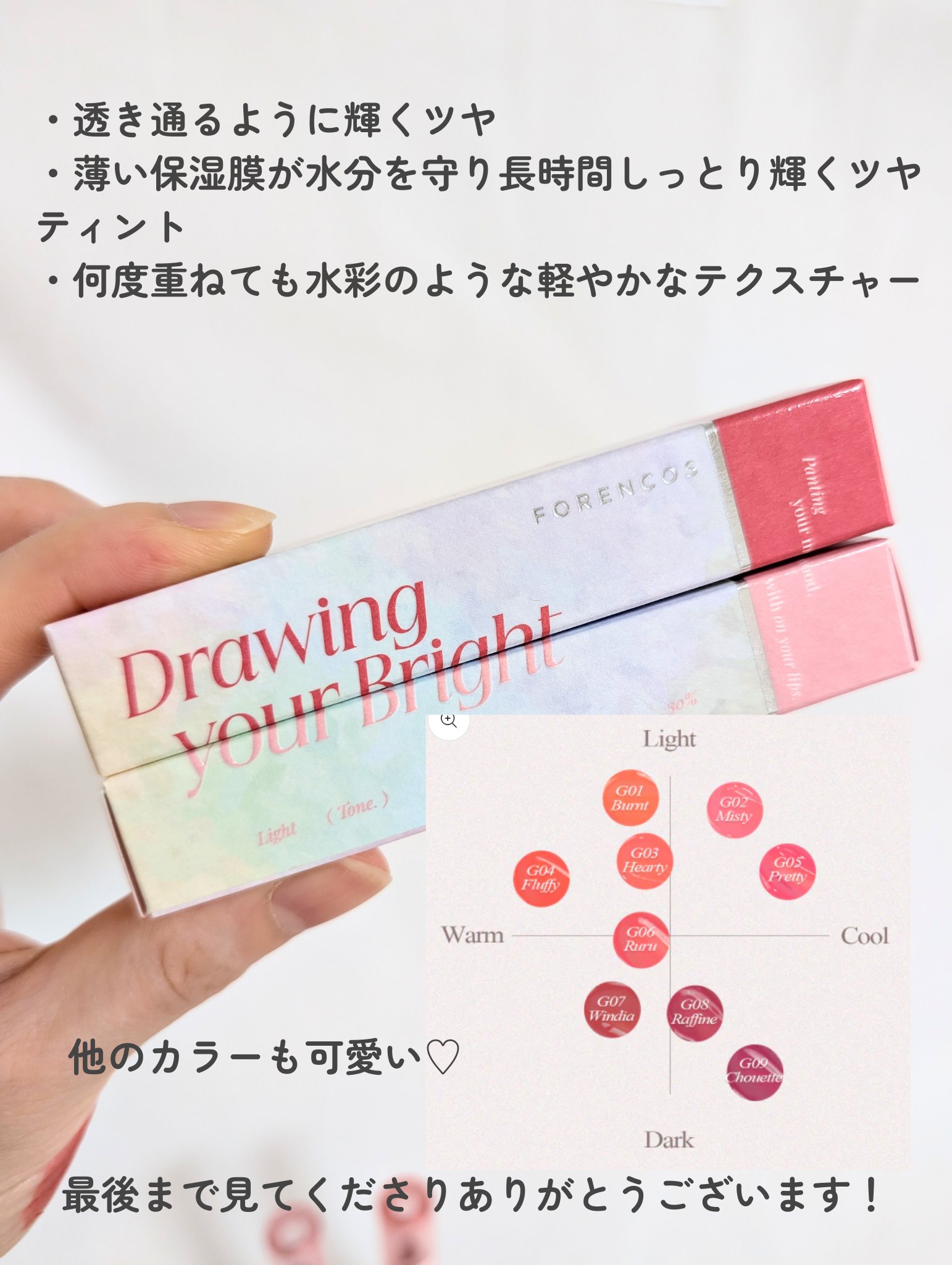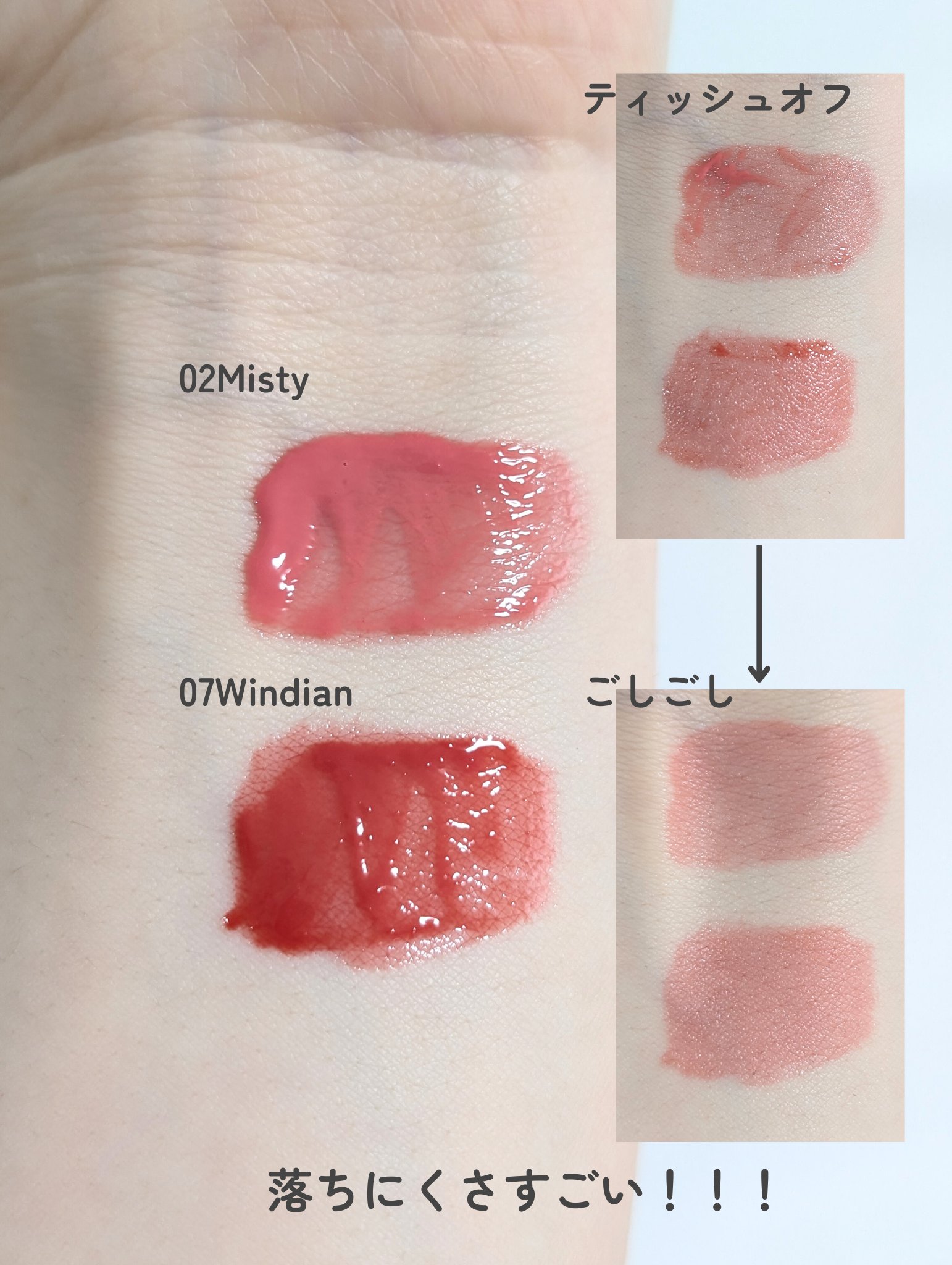 透き通る色彩とちゅるんとした水光ツヤがかわいいフォレンコスのティント♡ 重たさを感じないみずみずしいテクスチャーだけど、唇に馴染ませるとしっかり密着。 02 Misty はまさに美少女カラー めっっっちゃかわいいこの色…!