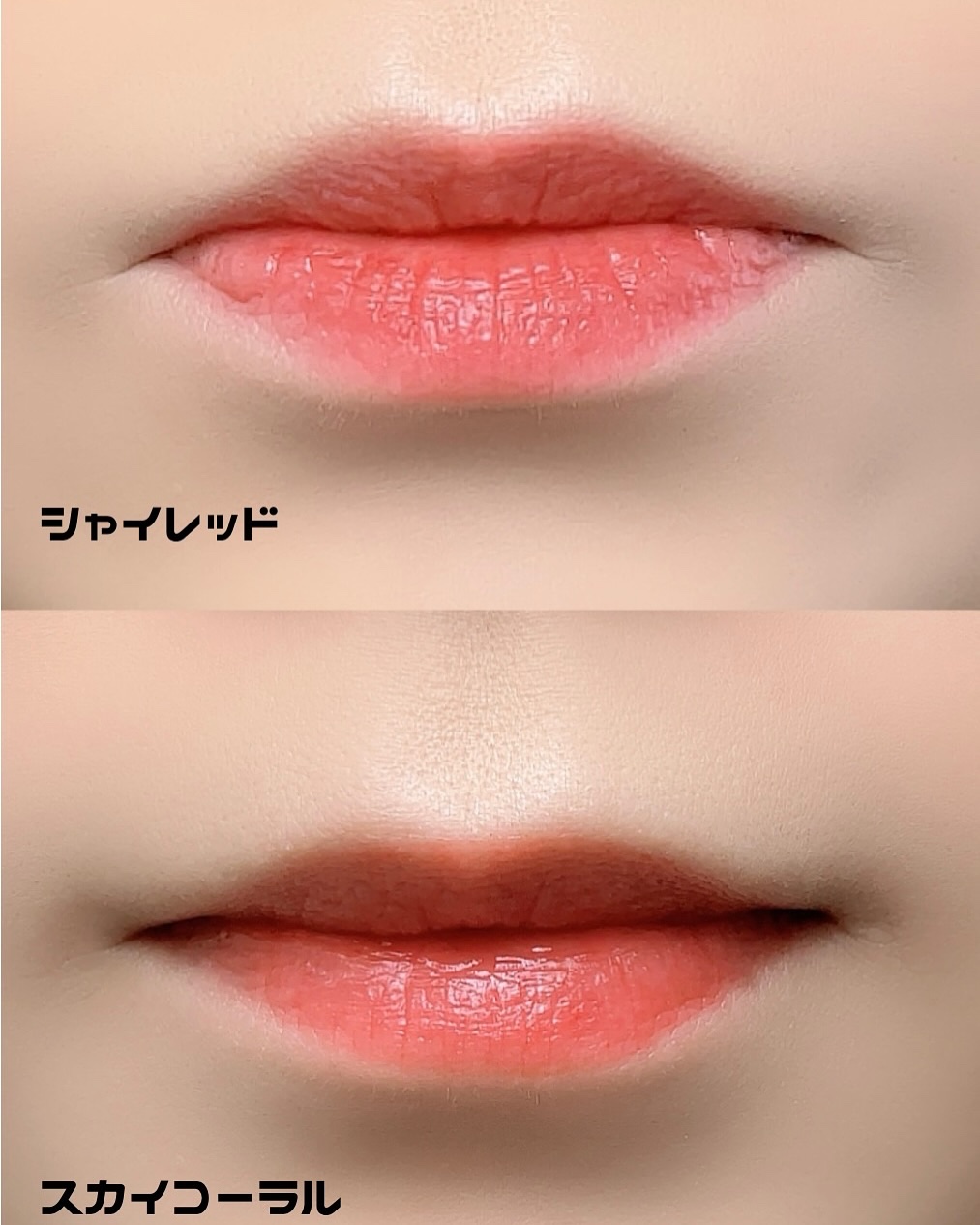 - <ロージー> 水添ポリ(C6-14オレフィン)、水添ポリイソブテン、トリ(カプリル酸/カプリン酸)グリセリル、(エチレン/プロピレン/スチレン)コポリマー、酢酸トコフェロール、ダイズ油、パルマローザ油、ニオイテンジクアオイ花油、ヒマシ油、ホホバ種子油、ローズマリー葉油、ダマスクバラ花油、オレンジ果皮エキス、テトラヘキシルデカン酸アスコルビル、レチノール、セラミドNP、ダイズポリペプチド、乳酸桿菌培養溶解質、加水分解エクステンシン、ヒアルロン酸Na、加水分解ヒアルロン酸、ヒアルロン酸クロスポリマーNa、ヒアルロン酸、アセチルヒアルロン酸Na、エチルヘキシルグリセリン、トリイソステアリン酸ポリグリセリル-2、ラウリン酸ポリグリセリル-10、(ブチレン/エチレン/スチレン)コポリマー、テトラ(ジ-t-ブチルヒドロキシヒドロケイヒ酸)ペンタエリスリチル、水、水酸化Al、トリエトキシカプリリルシラン、グリセリン、プロパンジオール、BG、1,2-ヘキサンジオール、水添レシチン、トコフェロール、メントキシプロパンジオール、マンダリンオレンジ果皮油、ベルガモット果実油、パチョリ油、カミツレ花油、ラベンダー油、酸化チタン、酸化鉄、赤201、赤202 <ベア> 水添ポリ(C6-14オレフィン)、水添ポリイソブテン、トリ(カプリル酸/カプリン酸)グリセリル、(エチレン/プロピレン/スチレン)コポリマー、酢酸トコフェロール、ヒマワリ種子油、ダイズ油、パルマローザ油、ニオイテンジクアオイ花油、ヒマシ油、ローズマリー葉油、ホホバ種子油、ダマスクバラ花油、ニンジン根エキス、オレンジ果皮エキス、レチノール、β-カロチン、セラミドNP、ダイズポリペプチド、乳酸桿菌培養溶解質、ヒアルロン酸Na、加水分解エクステンシン、ラウリン酸ポリグリセリル-10、ヒアルロン酸クロスポリマーNa、加水分解ヒアルロン酸、ヒアルロン酸、アセチルヒアルロン酸Na、テトラヘキシルデカン酸アスコルビル、エチルヘキシルグリセリン、(ブチレン/エチレン/スチレン)コポリマー、グリセリン、BG、水、プロパンジオール、1,2-ヘキサンジオール、トコフェロール、テトラ(ジ-t-ブチルヒドロキシヒドロケイヒ酸)ペンタエリスリチル、水添レシチン、メントキシプロパンジオール、マンダリンオレンジ果皮油、ベルガモット果実油、パチョリ油、カミツレ花油、ラベンダー油 <スカイコーラル> 水添ポリ(C6-14オレフィン)、水添ポリイソブテン、トリ(カプリル酸/カプリン酸)グリセリル、(エチレン/プロピレン/スチレン)コポリマー、酢酸トコフェロール、ダイズ油、パルマローザ油、ニオイテンジクアオイ花油、ヒマシ油、ホホバ種子油、ローズマリー葉油、ダマスクバラ花油、オレンジ果皮エキス、テトラヘキシルデカン酸アスコルビル、レチノール、セラミドNP、ダイズポリペプチド、乳酸桿菌培養溶解質、加水分解エクステンシン、ヒアルロン酸Na、加水分解ヒアルロン酸、ヒアルロン酸クロスポリマーNa、ヒアルロン酸、アセチルヒアルロン酸Na、エチルヘキシルグリセリン、トリイソステアリン酸ポリグリセリル-2、ラウリン酸ポリグリセリル-10、(ブチレン/エチレン/スチレン)コポリマー、テトラ(ジ-t-ブチルヒドロキシヒドロケイヒ酸)ペンタエリスリチル、水、グリセリン、プロパンジオール、BG、1,2-ヘキサンジオール、水添レシチン、トコフェロール、メントキシプロパンジオール、マンダリンオレンジ果皮油、ベルガモット果実油、パチョリ油、カミツレ花油、ラベンダー油、酸化チタン、酸化鉄、赤226、黄5 <シャイレッド> 水添ポリ(C6-14オレフィン)、水添ポリイソブテン、トリ(カプリル酸/カプリン酸)グリセリル、(エチレン/プロピレン/スチレン)コポリマー、酢酸トコフェロール、ダイズ油、パルマローザ油、ニオイテンジクアオイ花油、ヒマシ油、ホホバ種子油、ローズマリー葉油、ダマスクバラ花油、オレンジ果皮エキス、テトラヘキシルデカン酸アスコルビル、レチノール、セラミドNP、ダイズポリペプチド、乳酸桿菌培養溶解質、加水分解エクステンシン、ヒアルロン酸Na、加水分解ヒアルロン酸、ヒアルロン酸クロスポリマーNa、ヒアルロン酸、アセチルヒアルロン酸Na、エチルヘキシルグリセリン、トリイソステアリン酸ポリグリセリル-2、ラウリン酸ポリグリセリル-10、(ブチレン/エチレン/スチレン)コポリマー、テトラ(ジ-t-ブチルヒドロキシヒドロケイヒ酸)ペンタエリスリチル、水、グリセリン、プロパンジオール、BG、1,2-ヘキサンジオール、水添レシチン、トコフェロール、メントキシプロパンジオール、マンダリンオレンジ果皮油、ベルガモット果実油、パチョリ油、カミツレ花油、ラベンダー油、赤202、黄5