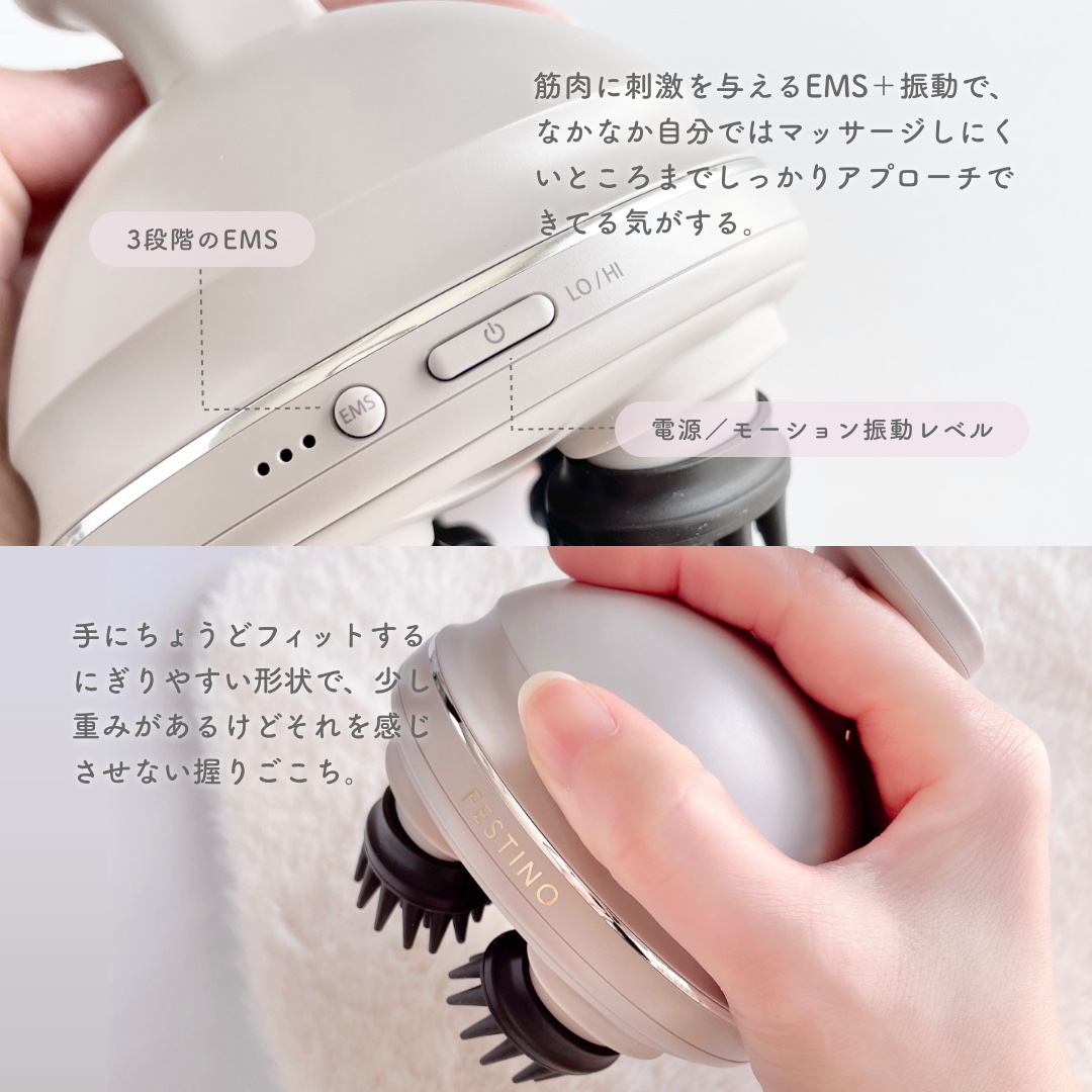 - スパニストの手技の体感をセルフケアで得られるヘッドスパ。頭皮が硬い、顔のエイジングサインに、全身リフレッシュしたい時にも◎ スパニストの手の動きを再現した「極技つまみ上げ」※実用新案取得(実用新案登録第3248422号)は、4つのブラシでつまみ上げながらしっかり頭皮や筋肉を動かすことで、リフトケア*1をかなえます。 2種類のアタッチメントブラシがそれぞれ4個ずつ付属。シリコン製で着脱もカンタン。目的に合わせて使い分けできます。 ●もみブラシ…全身をつまんで動かす(頭・表情リフレッシュ/柔軟にする/肩・デコルテまわりに) ●スパブラシ…地肌の刺激に(頭皮をリフレッシュ/毛穴爽快クレンジング/シャンプーと一緒に) フェスティノのEMSは3段階の刺激レベルを調節可能です。 日常生活では動かしにくい筋肉をEMSで刺激することにより、頭や首、肩などにリフトケア*1しながらアプローチします。 <EMS 使用の際のご注意>EMS は水分を通して電流を流します。使用したい部分を濡らしてご使用ください。 *1:リフトケアとは機器を上に持ち上げながら使用すること