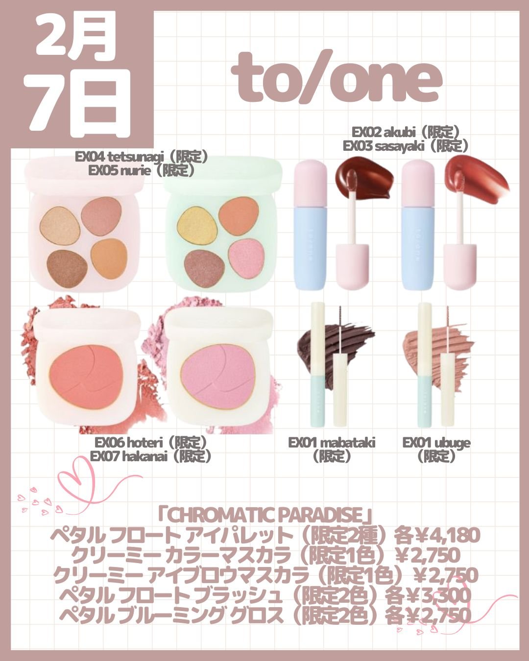 シルキースフレアイズ(限定1種)¥825 むにゅっとハイライター(限定1色)¥638 イルミネイティングフィニッシュパウダー~Abloom~(新1種)¥1,034 パウダーチークス(全4色)各¥660