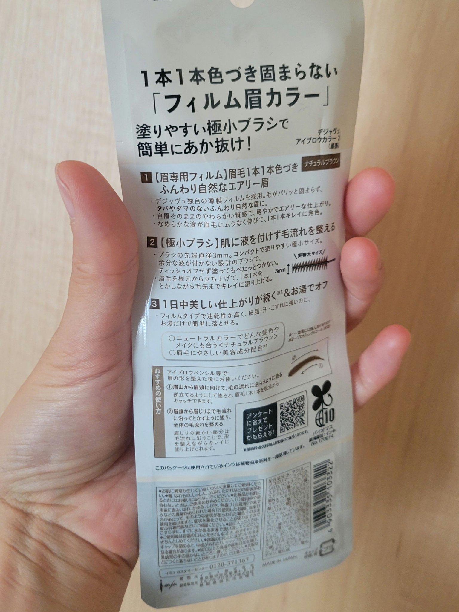 - \\25年3月定番新色モカグレージュ発売// 「フィルム眉カラー」なら眉の印象を自然にやわらげ、ふんわり質感の垢抜け眉に! 1.塗りやすい極小ブラシ ・ 先端直径3mmで、地肌に液がつきにくく根元から色づける ・余分な液がつかない設計で、ティッシュオフ不要 2.眉専用フィルム液 ・眉毛1本1本にキレイに色付き、自眉の黒さをやわらげる ・タバになったり、パリッと固まったりせず、まるで自眉のような仕上がり ・皮脂・汗・こすれに強いのにお湯で簡単オフ (※2025年9月以降、商品パッケージをリニューアル。) デジャヴュ アイブロウカラー