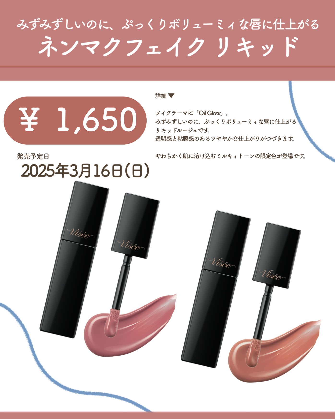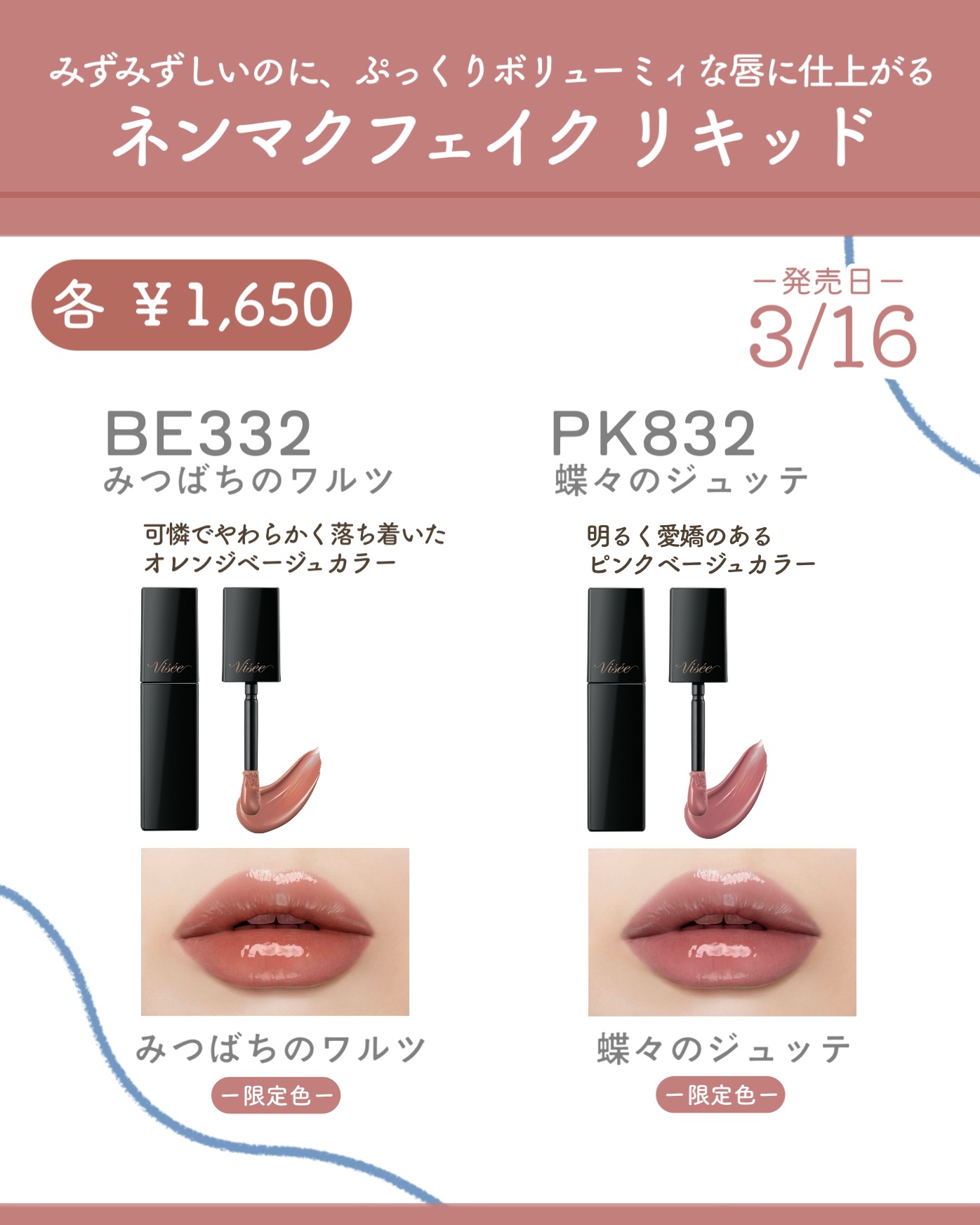ヴィセ(Visée)の2025年春新作コスメをご紹介します♡ 発売日:2025年3月16日(日) →ネンマクフェイク リキッド(限定2色)各¥1,650 ・PK832 蝶々のジュッテ(限定色) ・BE332 みつばちのワルツ(限定色)