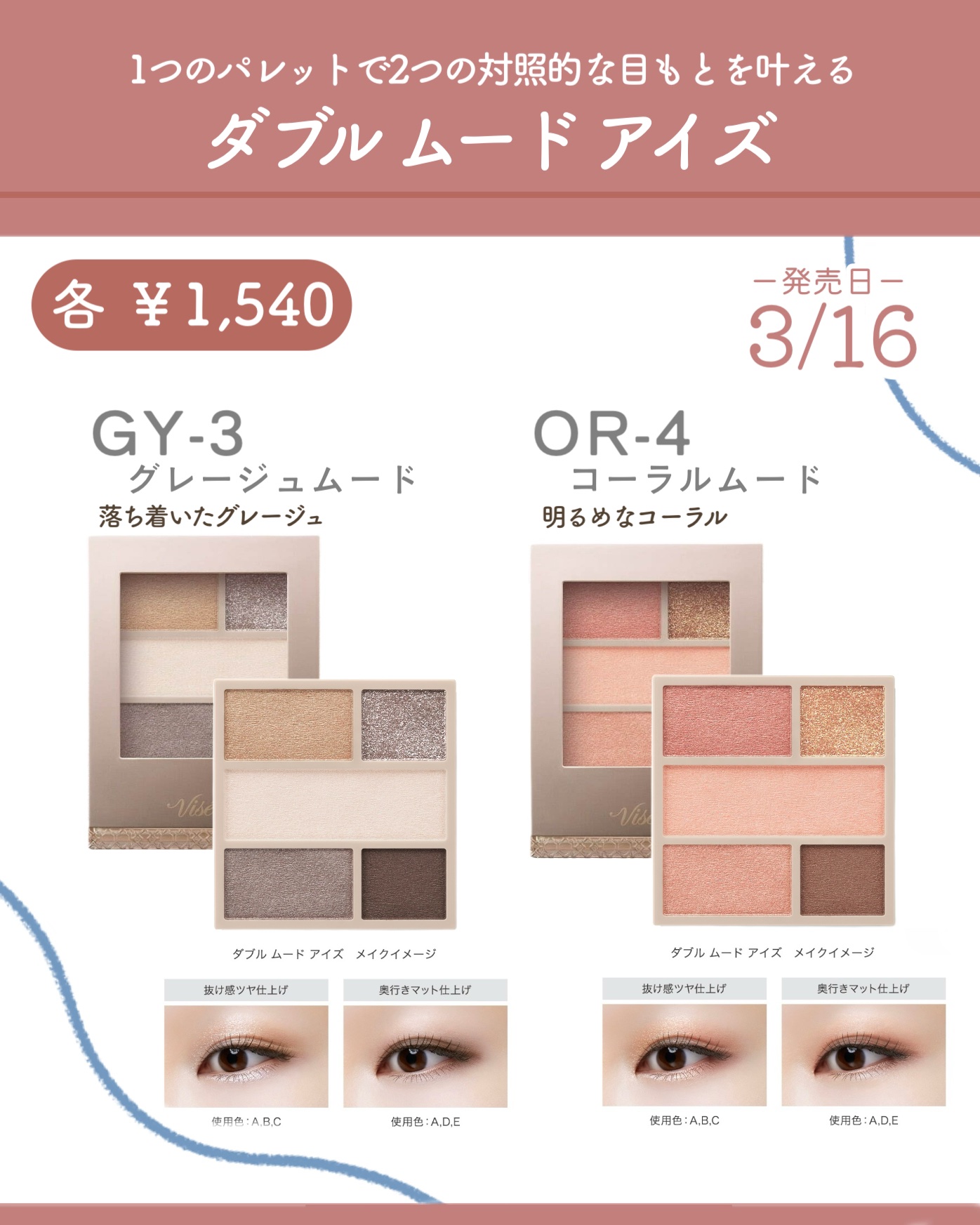 ダブル ムード アイズ BR-1、BR-2、GY-3、OR-4、PK-5、BL-6 各 1,540円(税込) ネンマクフェイク リキッド BE332、PK832 各 1,650円(税込) こちらの商品は、2025年3月発売予定の商品になります。