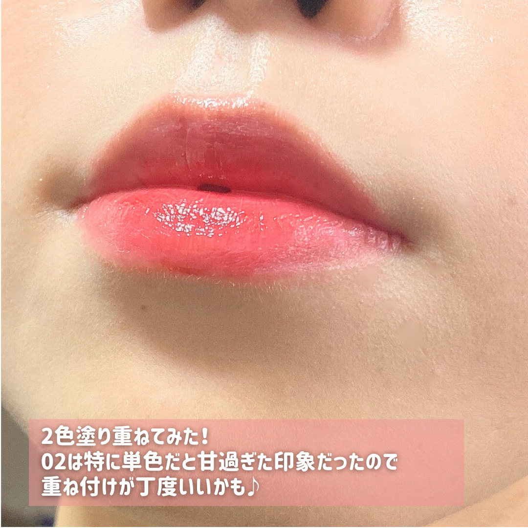 透き通るように輝く水光ツヤでぷるぷる唇になるよ🫶✨ 薄い保湿膜が水分を守り長時間しっとり輝く! 02 Mistyはピンクの光を纏ったヌーディーピンク!まさに可愛い女の子って感じのカラー! 乾燥せずに使えるのに色持ち良くて感動! ツヤ感も綺麗で色味も可愛くてお気に入り🥹🫧