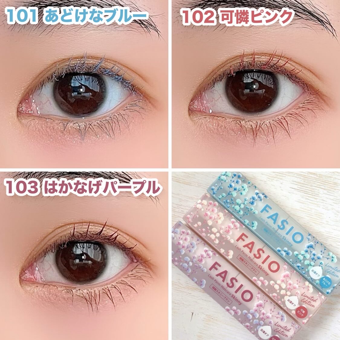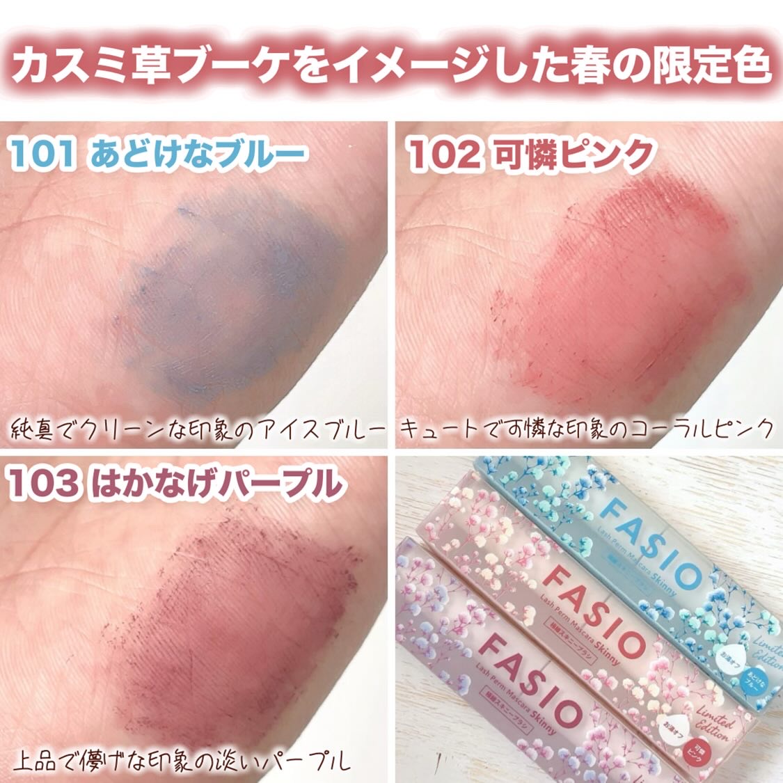 花束みたいなまつ毛へ🌸 ファシオの人気極細マスカラからカスミ草ブーケのようなやわらかい春カラーの3色が限定発売✨ 発色がすごい!見たままです👏 コスプレにも使えそうなしっかりカラーでとっても映えます♡ 一番ベーシックに使いやすいのは103かな? コームが細くて塗りやすいです✨